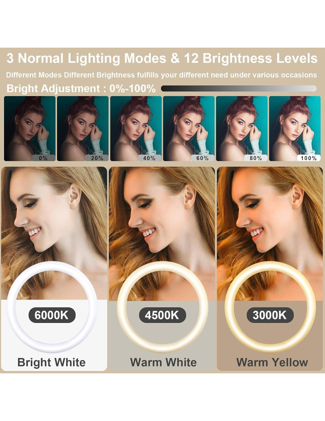 - [3 Modos CCT y 48 Modos de Color] Nuestro anillo de luz ofrece tres modos de iluminación convencionales, incluyendo luz cálida (3000K), luz natural (4500K) y luz blanca fría (6500K). También cuenta con 48 modos de color, incluyendo 7 colores estáticos monocromáticos y 41 modos dinámicos. Puedes alternar entre 51 modos de color y ajustar el brillo del 0 al 100% con 12 niveles de ajuste continuo para lograr la iluminación ideal que complemente tu tono de piel y entorno. Alto CRI para imágenes más precisas.