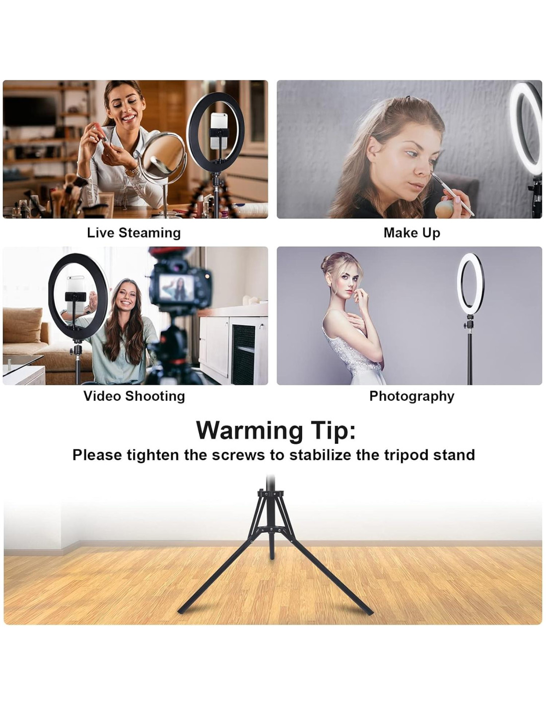 - [Trípode Ajustable y Conveniente] El trípode del anillo de luz para iPhone viene con un trípode de 63 pulgadas (160 cm) que se puede extender fácilmente hasta 76 pulgadas (193 cm) con el anillo de luz. Los mejorados cierres de palanca rápida te permiten ajustar la altura del soporte directamente, proporcionando flexibilidad y estabilidad. El paquete incluye dos trípodes diferentes: un trípode mini y un trípode extensible de 63 pulgadas (160 cm) para satisfacer tus necesidades específicas, ya sea que desees usar el anillo de luz en un escritorio o en el suelo.
