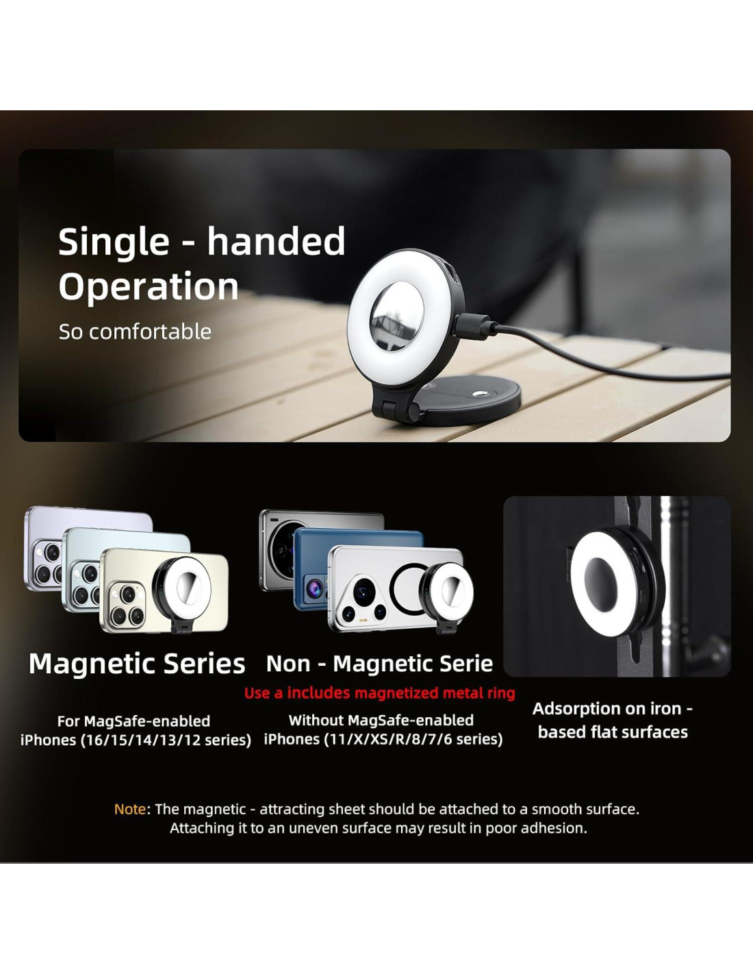 - 1. Compatibilidad Magnética y Universal Magnética Diseñada para iPhones habilitados para MagSafe (series 16/15/14/13/12), con alineación magnética perfecta. Incluye un adaptador adhesivo de anillo metálico para compatibilidad universal con dispositivos no MagSafe como iPhone 11/X/8, Samsung y Huawei. Sujeción segura para todas tus necesidades fotográficas.