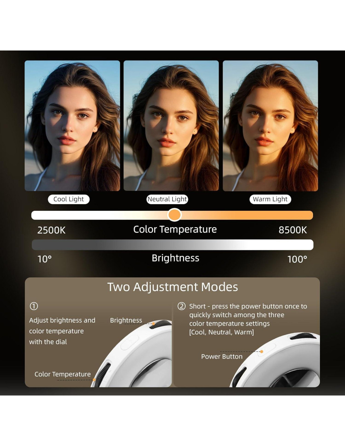 - 2. Luz de Anillo Ajustable Profesional con Iluminación Versátil Presenta una luz suave en forma de anillo con CRI>95 con 3 temperaturas de color (fría/neutra/cálida, 2500K-8500K) y control de brillo sin escalas (10-100%). El ángulo de giro ajustable de 180 proporciona la iluminación perfecta para selfies, fotografía, TikTok, vlogging y videoconferencias. Rueda de onda fácil de usar para un control preciso.