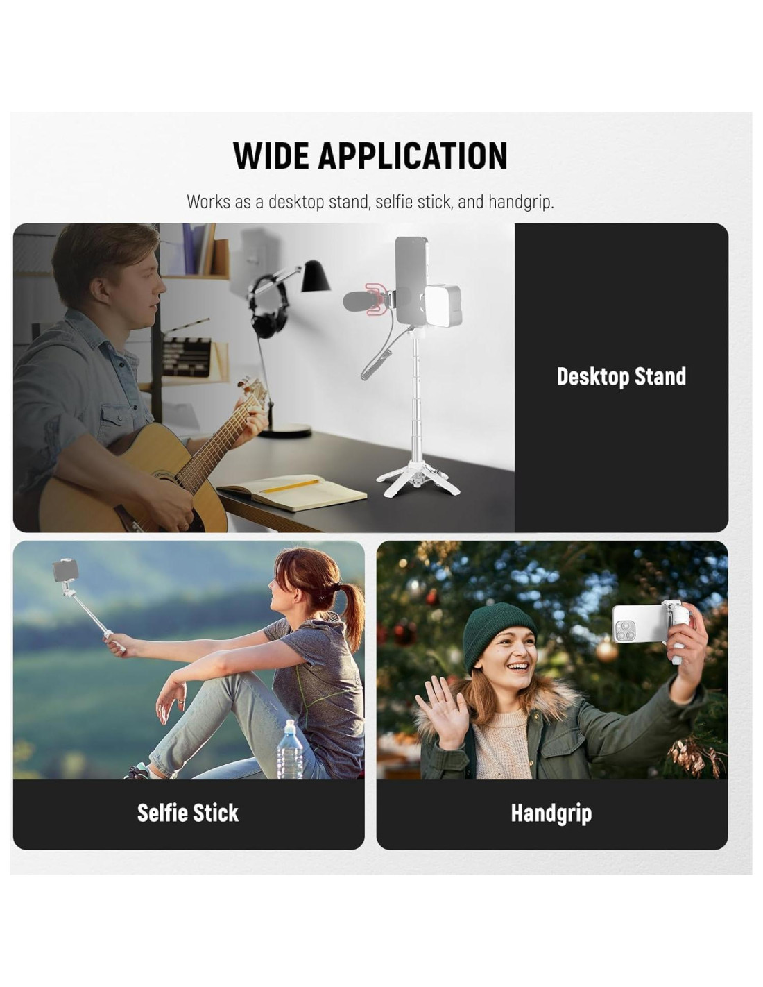 - Versátil Soporte de Palo de Selfie Este equipo multifuncional 3 en 1 combina un palo de selfie, un trípode de viaje y un soporte para teléfono celular para vlogs de YouTube/TikTok, grabación de video, transmisiones en vivo, diarios de viaje, fotografía, videoconferencias, llamadas de Zoom y más. Plegable a 4"" (10cm) y ligero (4.2oz (119g)), este equipo puede caber fácilmente en tu bolsillo para grabaciones al aire libre