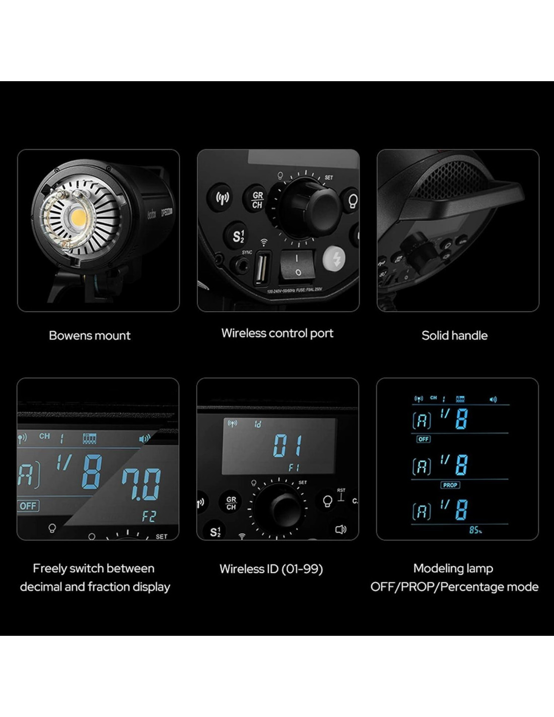 - Sistema inalámbrico Godox 2.4G X incorporado que soporta control remoto inalámbrico y activación. Utiliza X2T, serie Xpro, XT16 o control remoto FT-16 para lograr activación y control sincrónico inalámbrico