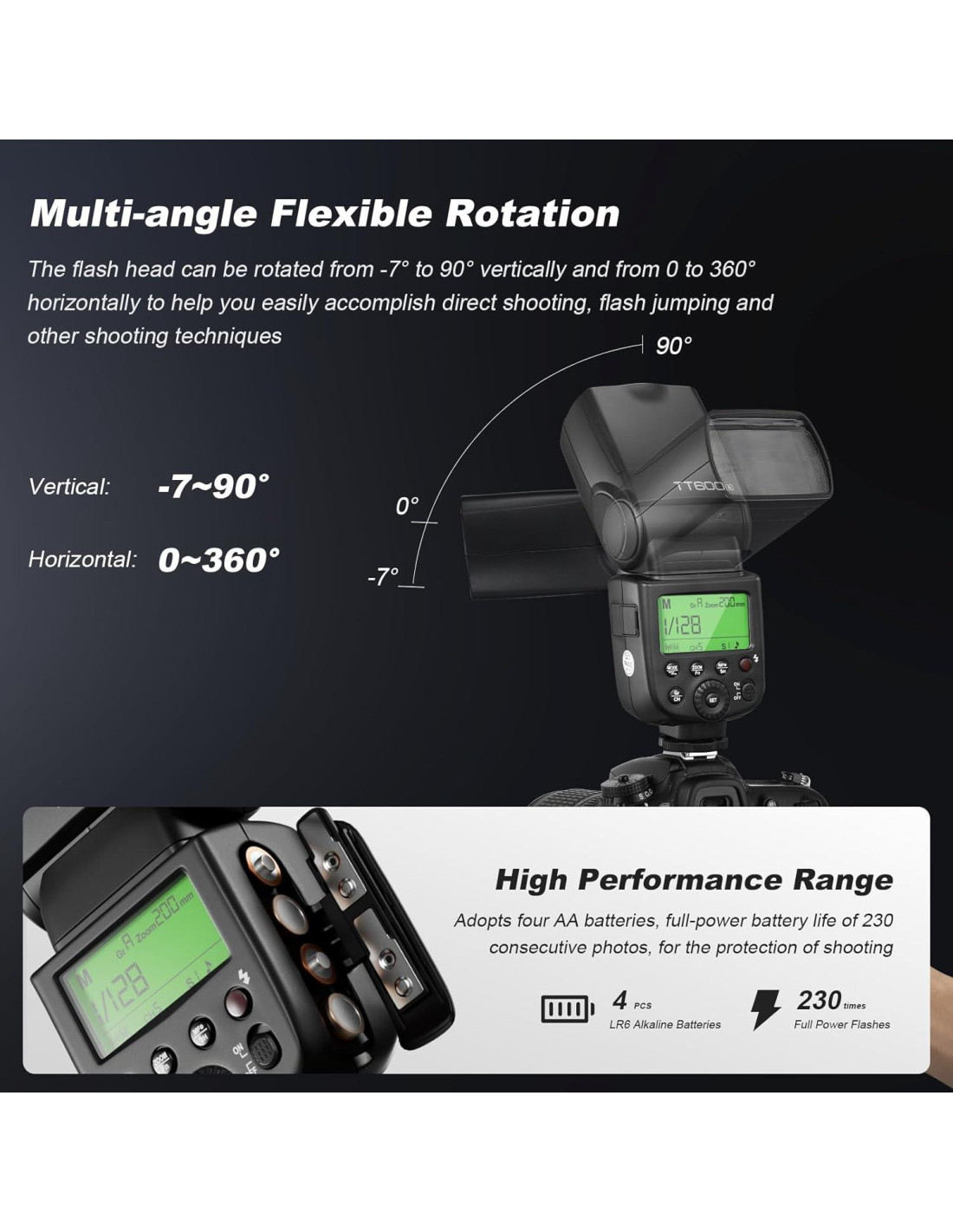 - [Excelente rendimiento] Tiempo de reciclaje más rápido: 0.1-2.6s tiempo de reciclaje a plena potencia (con baterías Ni-MH) aproximadamente 230 destellos a plena potencia (con baterías Ni-MH de 2500mA), proporciona suficientes tiempos de flash para tu disparo. GN60 (m ISO 100) número guía alto, 1/300s - 1/20000s duración de flash corta, temperatura de color estable de 5600+/-200K.