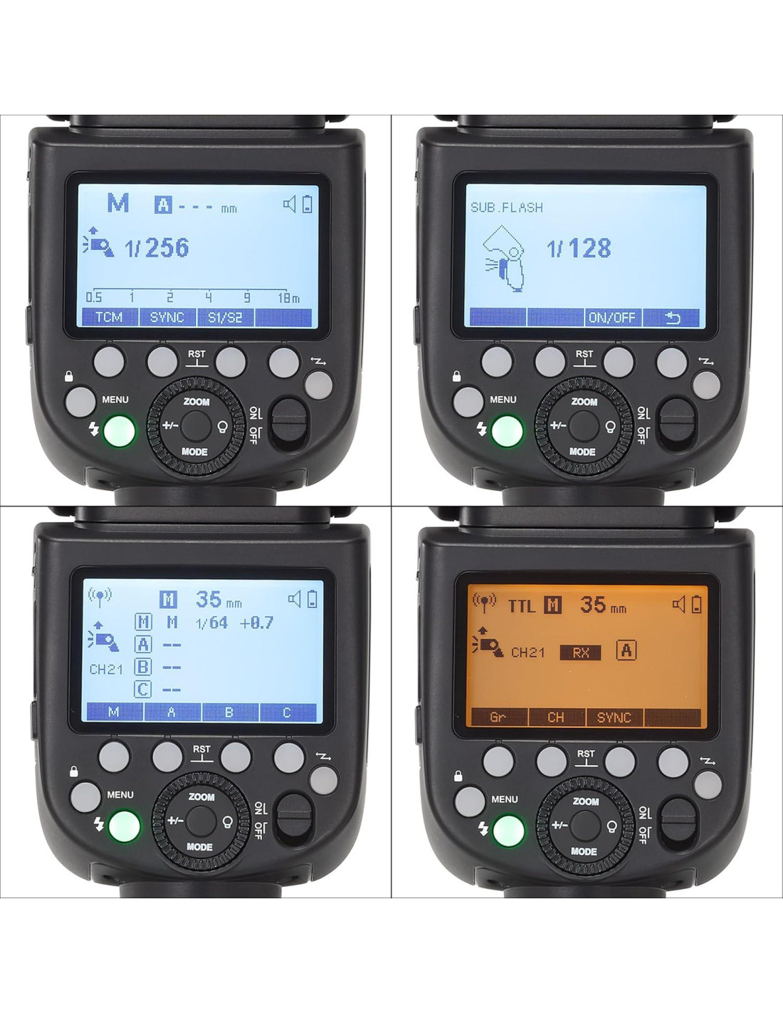 - Modo manual desde plena potencia (1/1) hasta 1/256 (en 81 pasos) para el Flash Principal y Sub-Flas para los controladores exigentes