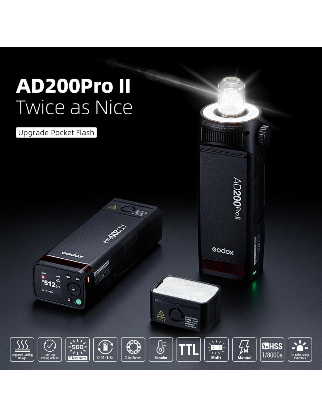 - Alta Compatibilidad: Sistema inalámbrico Godox 2.4G incorporado, AD200ProII compatible con disparadores del sistema Godox X, compatible con Canon, Nikon, Sony, Olympus, Panasonic, Fujifilm, Pentax, Leica, etc., también se puede usar en combinación con flashes de cámara Godox, flashes exteriores, flashes de estudio, etc.