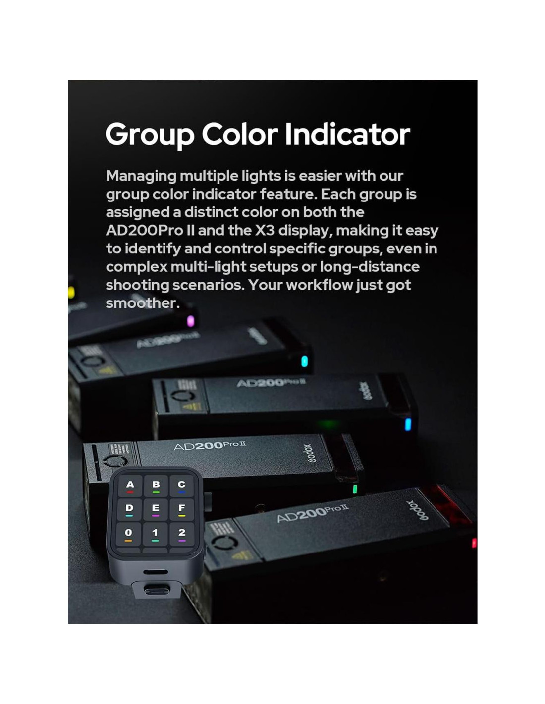 - Indicador de Color de Grupo: Gestionar múltiples luces es más fácil con nuestra función de indicador de color de grupo. Cada grupo se asigna un color distinto tanto en el AD200Pro II como en la pantalla del X3, facilitando la identificación y control de grupos específicos, incluso en configuraciones complejas de múltiples luces o en escenarios de disparo a larga distancia. Tu flujo de trabajo se ha vuelto más fluido.