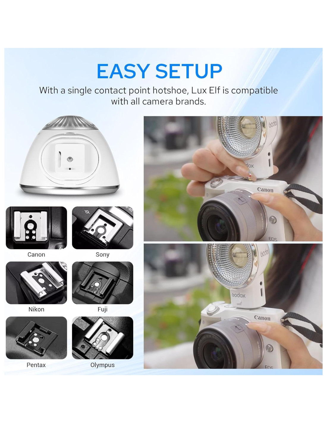 - Verificar compatibilidad antes de comprar: el Godox Lux Elf solo es compatible con la mayoría de las cámaras con zapata fría de contacto único, por favor confirma si tu cámara tiene una zapata fría de contacto único antes de comprar, de lo contrario el producto será incompatible o inutilizable. [Ligero y portátil] : 96g, diseño ultra pequeño y ultra ligero.