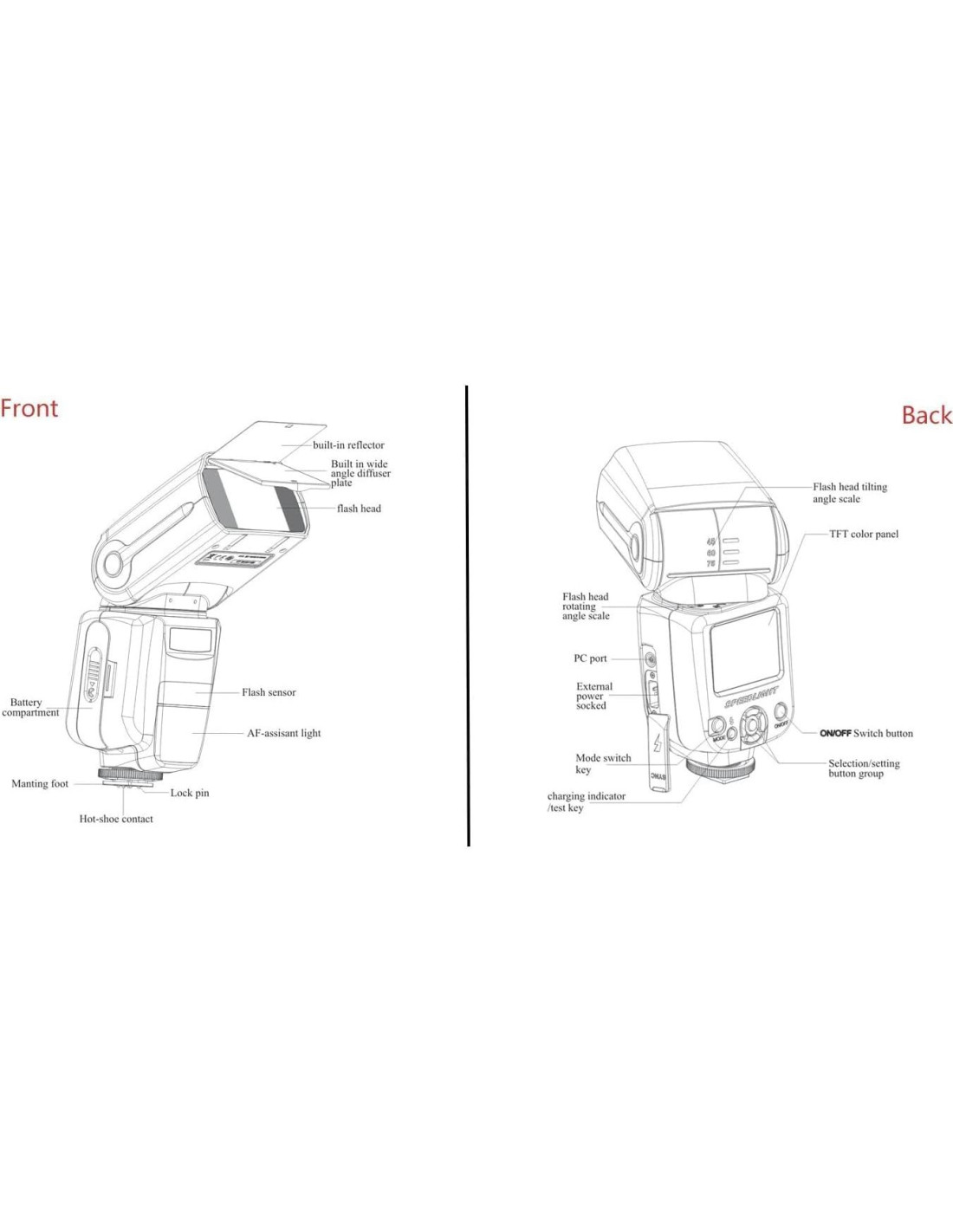 - Este flash se conectará directamente a la zapata caliente de su cámara. Este flash también puede disparar de forma inalámbrica si es activado por un segundo flash similar. Modos de flash: M, S1, S2, Multi.