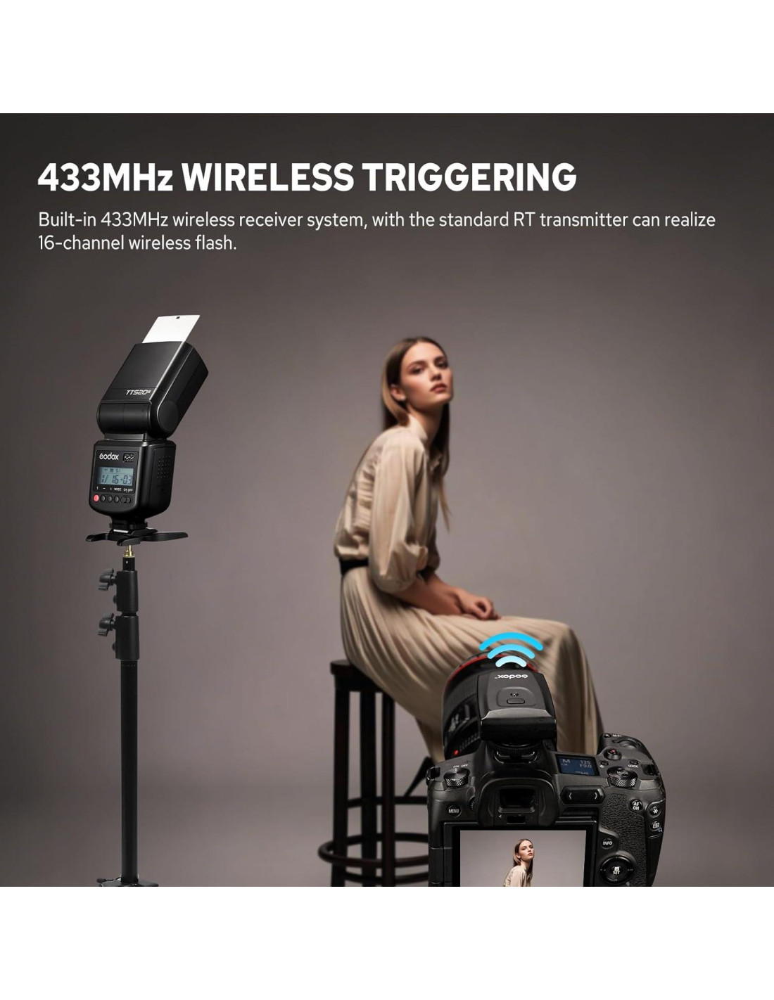 - Disparo Inalámbrico de 433MHz: El flash Godox TT520III (Godox TT520II Mejorado) está equipado con un receptor inalámbrico integrado de 433MHz, cuando se usa con el transmisor estándar RT-16, que soporta 16 canales de disparo inalámbrico cuando se usa en conjunto con la cámara, logrando fácilmente la sincronización del flash y el control remoto suave