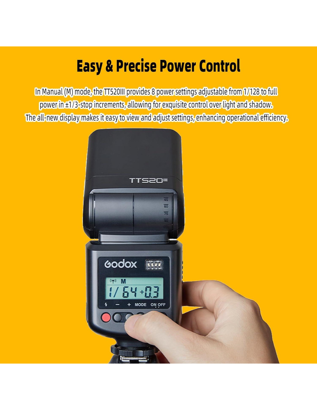 - Control de Potencia Fácil y Preciso--En modo Manual (M), el TT520III proporciona 8 configuraciones de potencia ajustables de 1/128 a potencia completa en incrementos de +/-1/3 de paso, lo que permite un control exquisito sobre la luz y la sombra. La nueva pantalla facilita la visualización y ajuste de configuraciones, mejorando la eficiencia operativa.