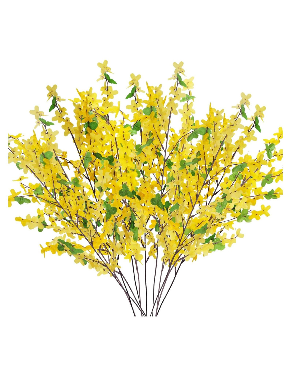 La réplica perfecta de la naturaleza, estas flores de forsitia siempre están en flor, lo que da la bienvenida a una sensación permanente de primavera. Solo colócalas en un jarrón y luego exhibe con orgullo el arreglo en cualquier habitación para realzar el aspecto de tu decoración simple pero sofisticada. Especificaciones: Material: Seda, alambre de hierro Color: Amarillo Dimensiones: 60-65cm Nota: Debido al transporte a larga distancia, algunos pétalos pueden caerse, pero no afectará su belleza. (Además, si tienes paciencia, puedes instalar los pétalos caídos) Flores hechas de seda y los tallos hechos de alambre de hierro. Puedes torcerlo a cualquier forma y altura que desees. Todas las hojas se pueden quitar e instalar. Las plantas artificiales no necesitan agua, luz solar ni fertilizante, nunca se marchitarán ni caerán. De esta manera, puedes sentir el aliento de la naturaleza durante todo el año. Perfecto para decoración del hogar, dormitorio, jardín, oficina, balcón, decoración de bodas, etc. No solo añaden vitalidad y naturalidad a tu hogar, sino que también añaden más color y textura al ramo. ¡Trae la sensación de naturaleza a tu decoración!