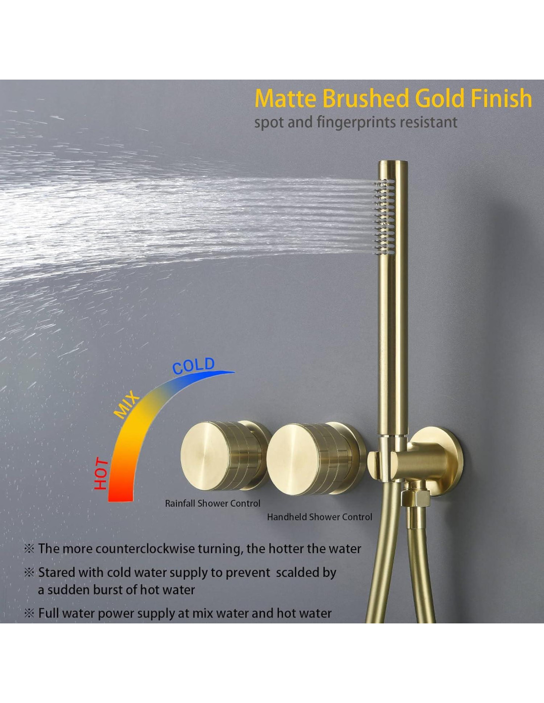 - Sistema de Ducha de 30 cm con Características de Seguridad: Completo con válvula de mezcla de agua caliente/fría empotrada y kit de acabado. Cada manija comienza con agua fría para prevenir quemaduras, luego mezcla gradualmente a caliente a medida que giras en sentido antihorario, asegurando un ajuste de temperatura seguro.