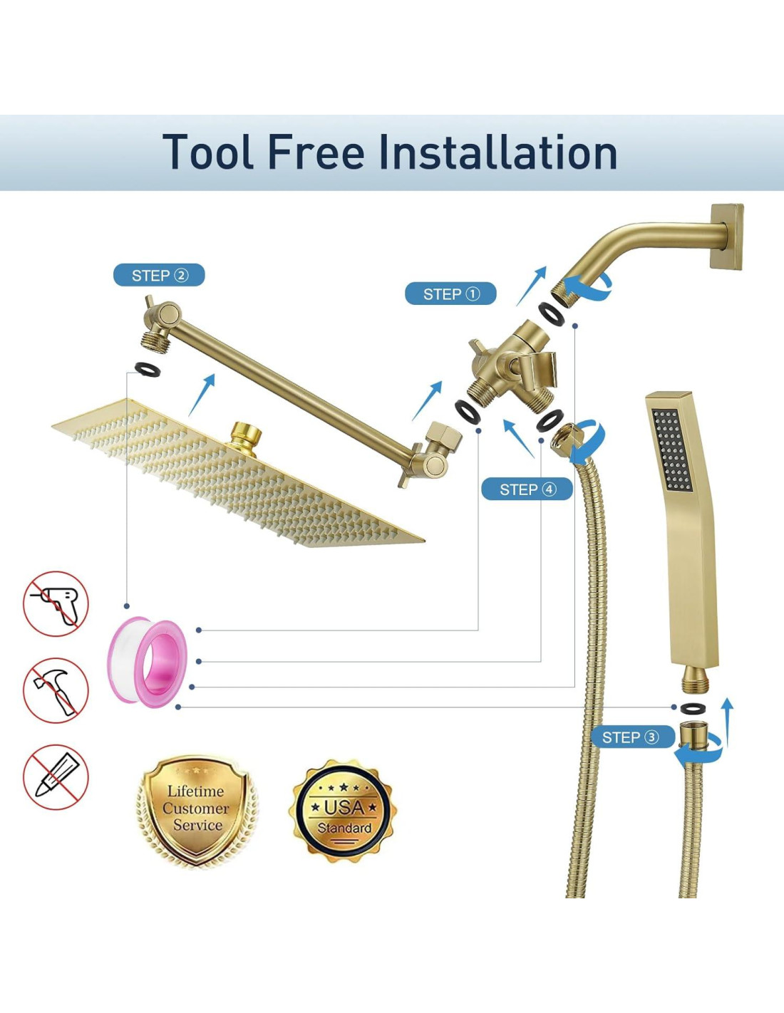 - Lista de Empaque: Cabezal de ducha de lluvia cuadrado de 10" (25.4 cm), cabezal de ducha de mano de 4.5'' (11.43 cm), brazo de ducha de extensión de 12" (30.48 cm), desviador de 3 vías, manguera de ducha de acero inoxidable de 60'' (152.4 cm), regulador de flujo de agua, cintas de Teflón, filtros de repuesto, arandelas y manual de instrucciones. Si hay alguna omisión, no dudes en contactarnos para reemitir.