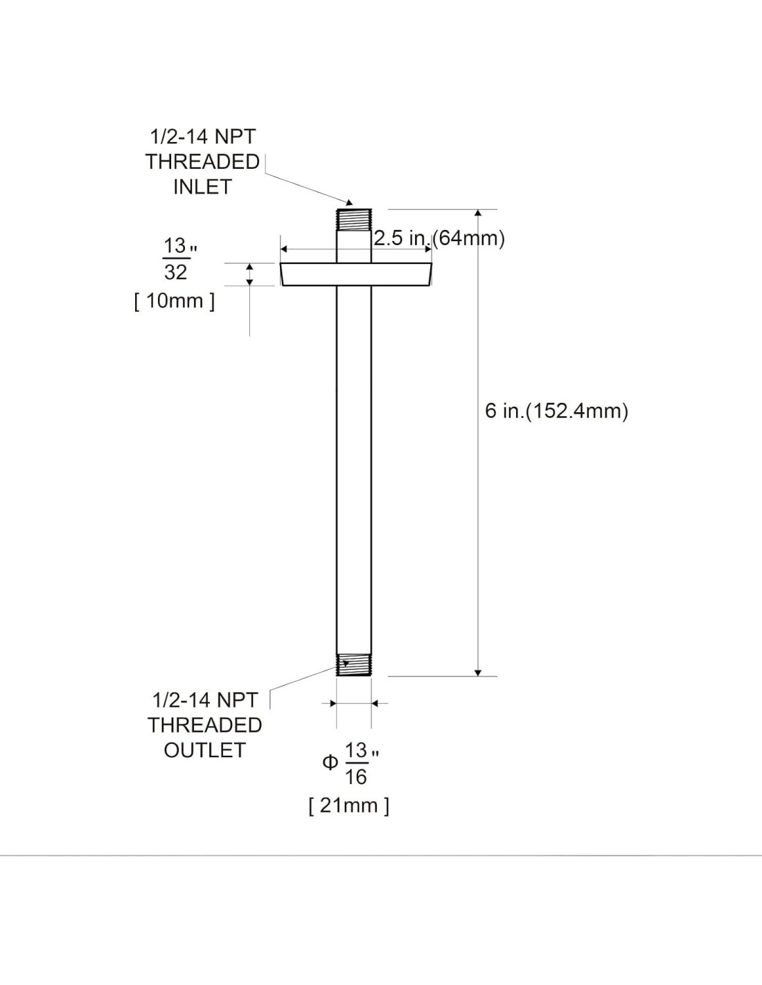 - [Instalación y Especificaciones] Instrucciones detalladas aseguran una instalación sin preocupaciones. El producto mide 6 pulgadas (15,24 cm) de largo, la especificación de rosca de entrada es 1/2"-14 NPT, adecuado para tubos de ducha estándar. La especificación de rosca de salida es 1/2"-14 NPT (compatible con rosca IPS de 1/2"), adecuado para rociadores de interfaz estándar.