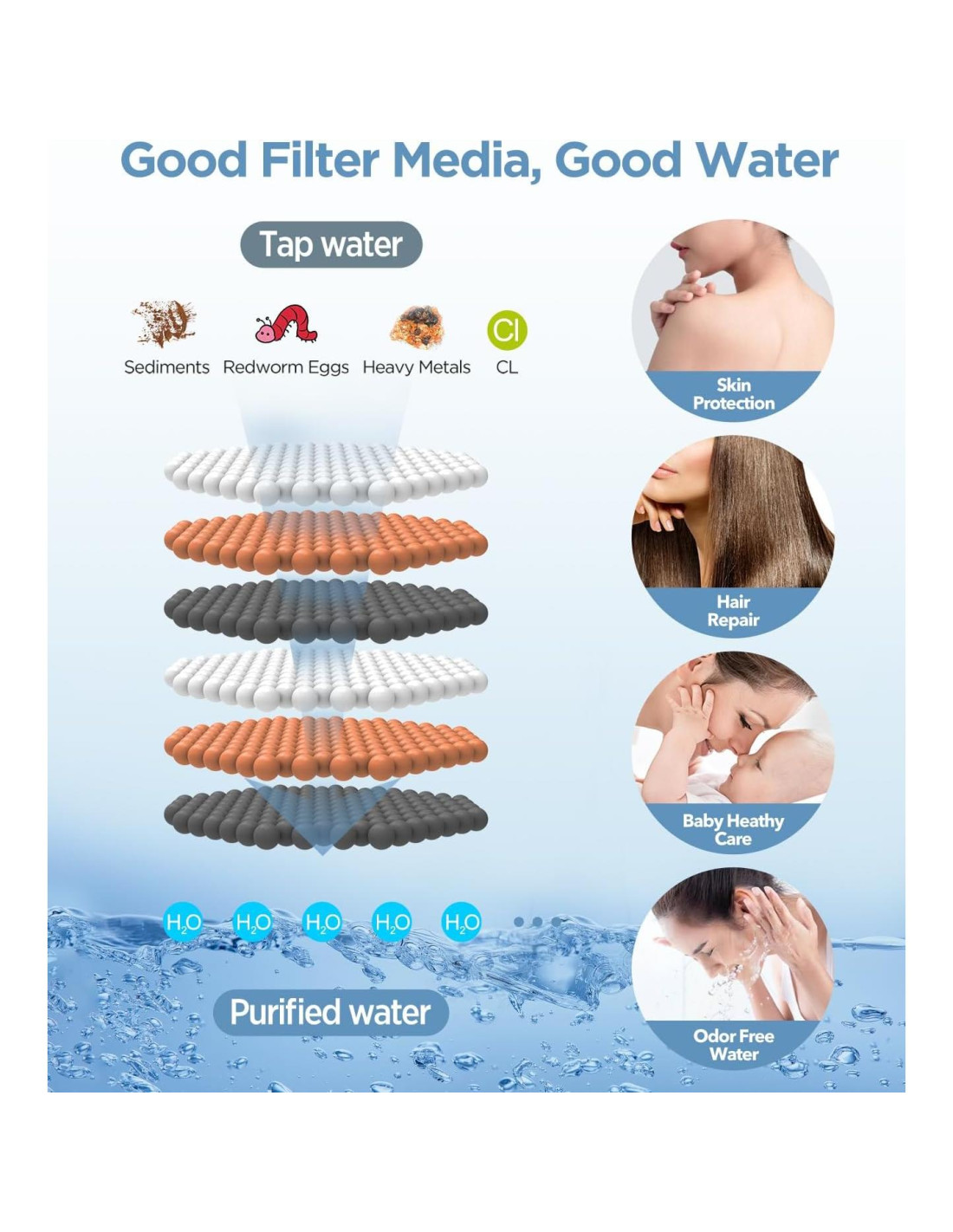 - Filtro de Cabezal de Ducha para Agua Dura: El cabezal de ducha de mano MakeFit cuenta con un potente sistema de filtración de múltiples etapas, que incluye varias bolas de piedra mineral que purifican y filtran eficazmente el agua de tu ducha. Este cabezal de ducha ablandador elimina eficazmente el cloro, el flúor, los metales pesados y otras sustancias nocivas del agua, proporcionando protección para tu piel, cabello y la salud general de ti y tu familia