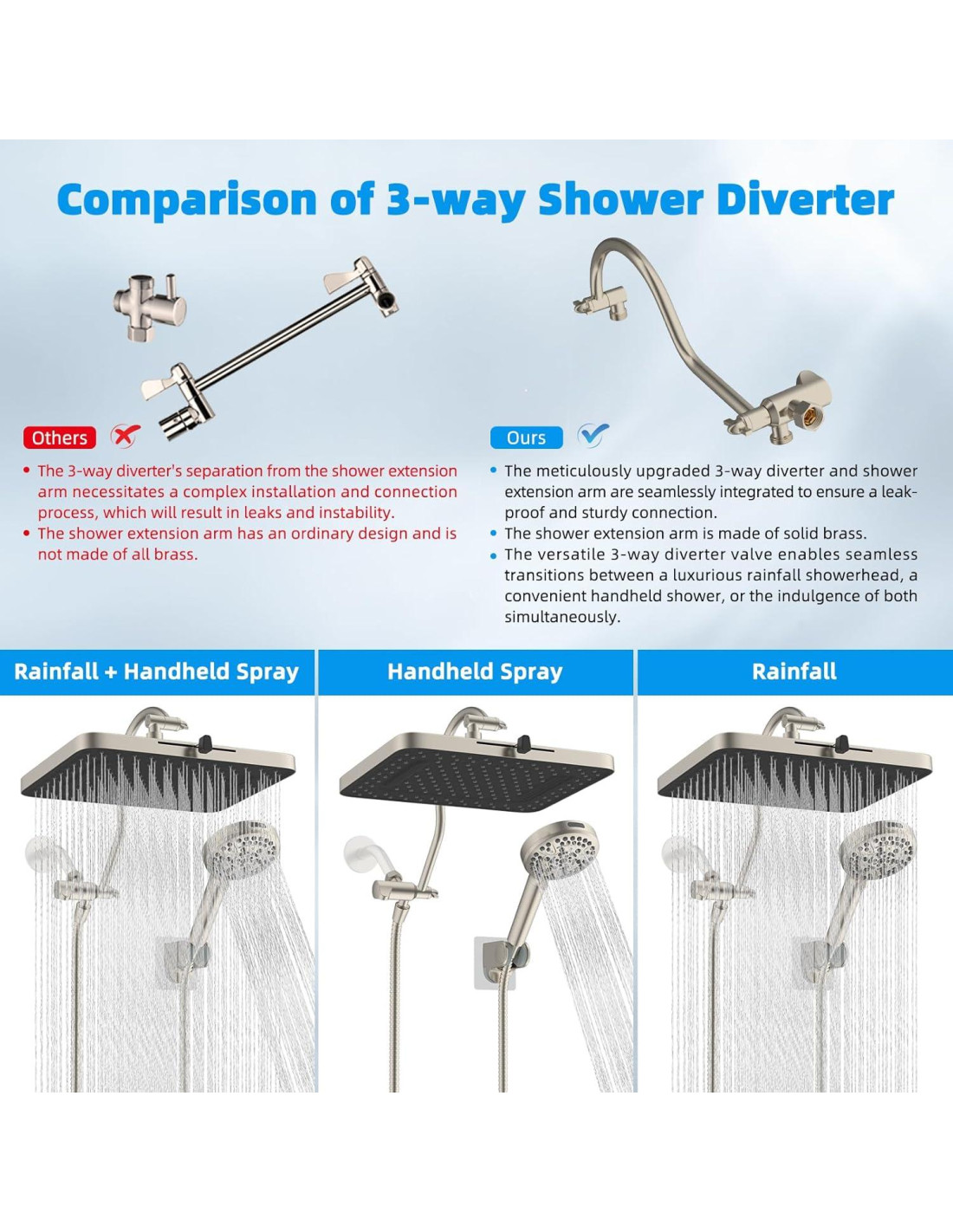 - Válvula de Desviación de 3 Vías Mejorada: Este combo de cabezal de ducha se instala fácilmente sin herramientas ni plomero. La válvula de desviación de 3 vías ofrece la flexibilidad de usar el cabezal de ducha o el cabezal de ducha de lluvia por separado o disfrutar de ambos simultáneamente. Nuestra válvula de desviación de 3 vías y el brazo de extensión de ducha están diseñados para conectarse sin fugas ni temblores. En contraste, una válvula de desviación de 3 vías ordinaria requiere instalación y conexión separadas al brazo de extensión, lo que puede llevar a fugas e inestabilidad.