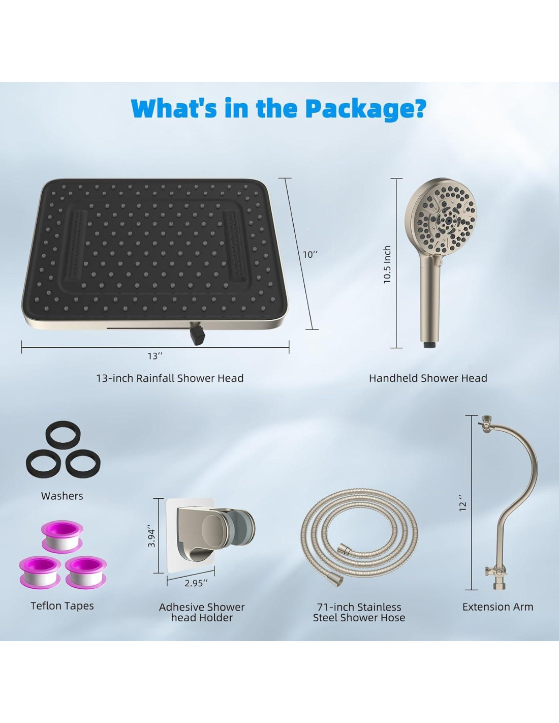 - Cabezal de Ducha de Lluvia Mejorado: Este cabezal de ducha de lluvia de 13 pulgadas tiene 157 jets de salpicadura que proporcionan un rocío de lluvia lujoso que envuelve su cuerpo con gotas completas, brindando una experiencia de masaje de alta presión dinámica incluso en niveles bajos de presión de agua. El diseño versátil de 5 configuraciones le permite cambiar sin esfuerzo entre 5 rocíos para disfrutar de una ducha de limpieza cómoda adaptada a cada una de sus preferencias.