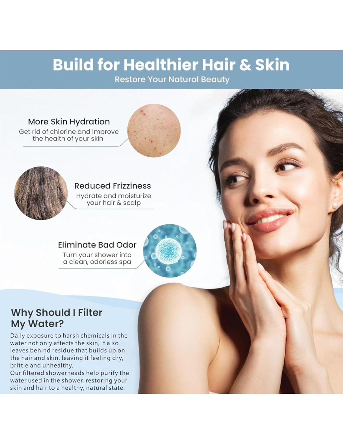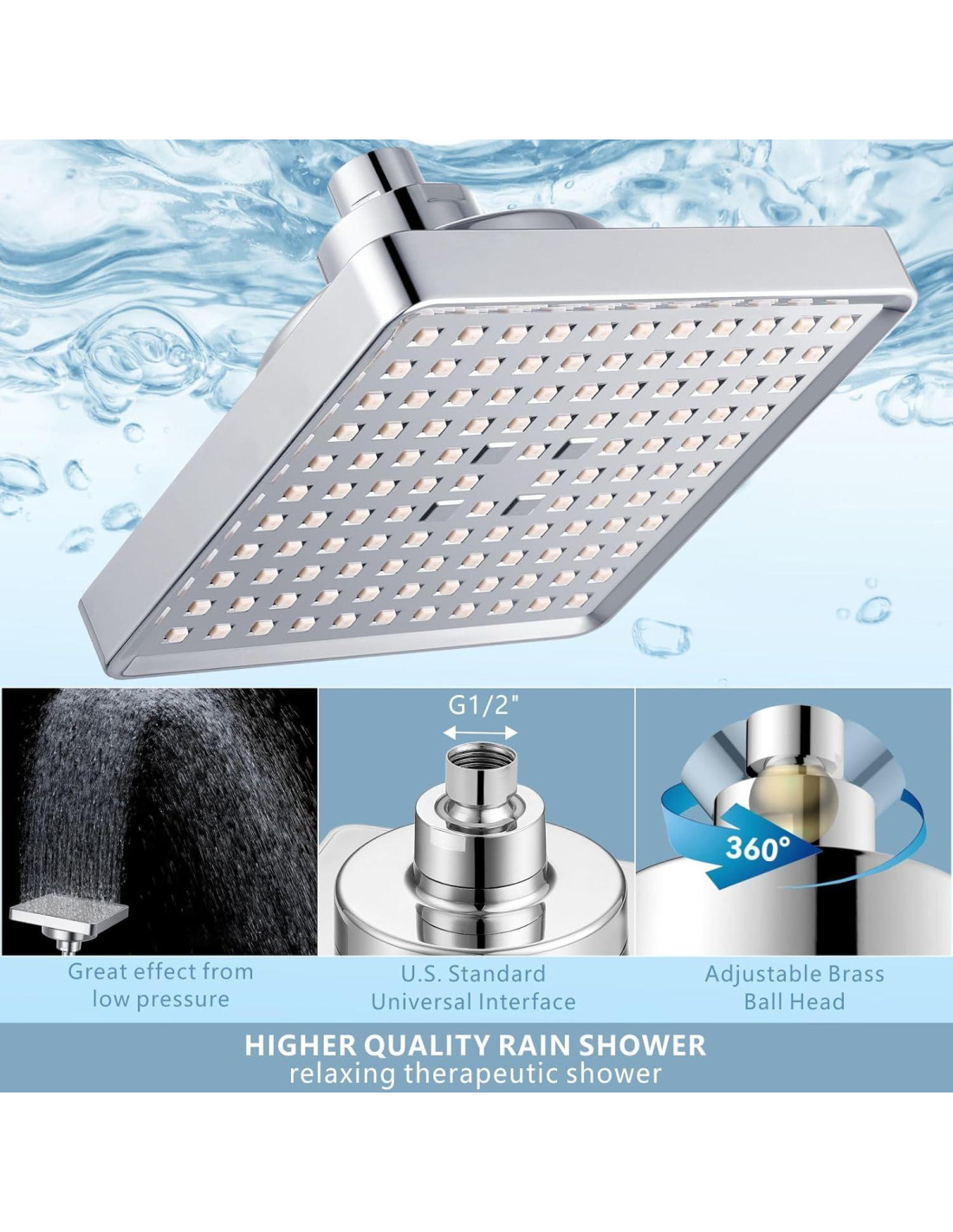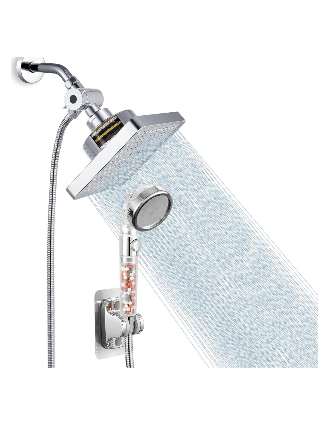 - CALIDAD DEL AGUA MEJORADA - Nuestros cabezales de ducha cuadrados de 6" (15 cm) y duchas de mano tienen filtros reemplazables integrados, cartuchos de filtro de múltiples capas (incluidos KDF 55, bolas de cerámica alcalina, carbón activado, vitamina C y sulfito de calcio) que eliminan efectivamente cloro, flúor, metales pesados e impurezas, suavizando el agua de tu ducha, para promover una piel más saludable y reducir el daño al cabello.