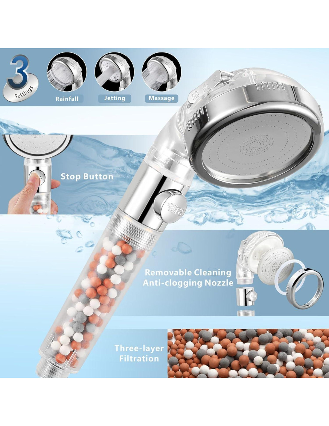 - MANUAL 3 MODOS - Forma de rociado de Lluvia/Masaje/Chorro, Cada modo te brinda a ti y a tu familia la mejor experiencia de ducha tipo SPA; El agua es fina, densa y uniforme, lo que hace que la piel se sienta suave y cómoda. Configuración de interruptor de pausa ON/OFF, al mismo tiempo ahorrando agua hasta un 30%.