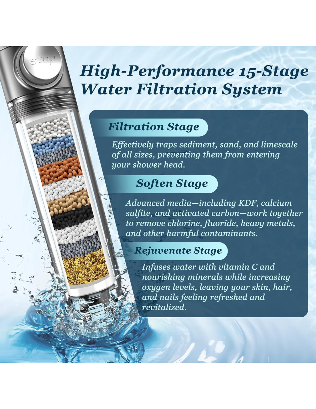 - Sistema de Filtración Avanzado - Agua Pura y Limpia para una Piel y Cabello Más Saludables. Como sabes, el agua del grifo contiene cloro residual, óxido, metales pesados y otras impurezas. Si usamos agua de baño sin filtrar durante un largo período de tiempo, podemos enfrentar varios problemas de piel y cabello. Ahora podemos ayudar a resolver esos problemas por ti. Equipado con un potente sistema de filtración, que incluye KDF-55 de primera calidad, sulfito de calcio avanzado, carbón activado, vitamina C y más materiales beneficiosos, nuestros filtros de ducha eliminan efectivamente hasta el 99.9% del cloro, metales pesados y otras sustancias dañinas que pueden causar piel seca, cabello encrespado, cambios de color u otros problemas de piel y cabello.