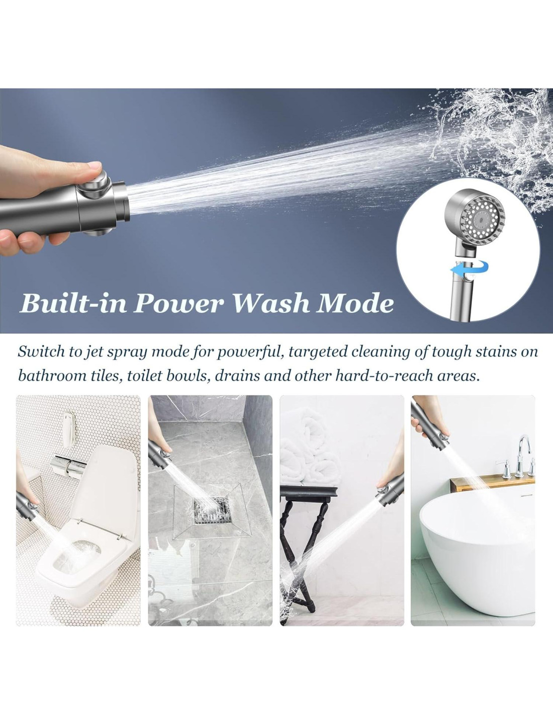 - 4 Modos de Rocío - Encuentra Tu Experiencia de Ducha Perfecta. Presenta 3 configuraciones de rocío de ducha intercambiables (Lluvia, Neblina, Mezcla), sin configuraciones complicadas necesarias, lo que te permite personalizar fácilmente tu experiencia de ducha. Pero eso no es todo, simplemente separa el cabezal de ducha de su mango, ¡se transformará en un modo de lavado a alta presión! Puedes enjuagar rápidamente grandes áreas o eliminar la suciedad obstinada con facilidad. Con esta funcionalidad, limpiar tu ducha, bañera, azulejos, incluso a tus mascotas, se vuelve más rápido y simple que nunca.