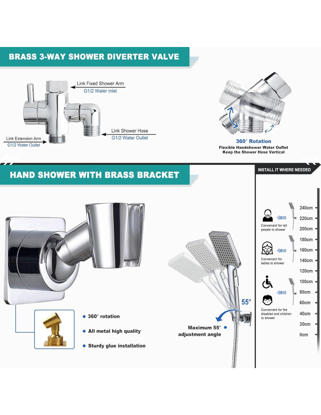 - [Soporte de ducha de latón sólido] : Todo metal, sin plástico, rotación libre de 360. Comparado con plásticos en el mercado que son propensos a agrietarse y caer, nuestros soportes de alta resistencia, de calidad premium, impermeables y resistentes al óxido, nunca se caerán. Necesita ser instalado en una superficie sólida y lisa. Después de la instalación, se puede girar fácilmente usando la acción de palanca de la ducha de mano.