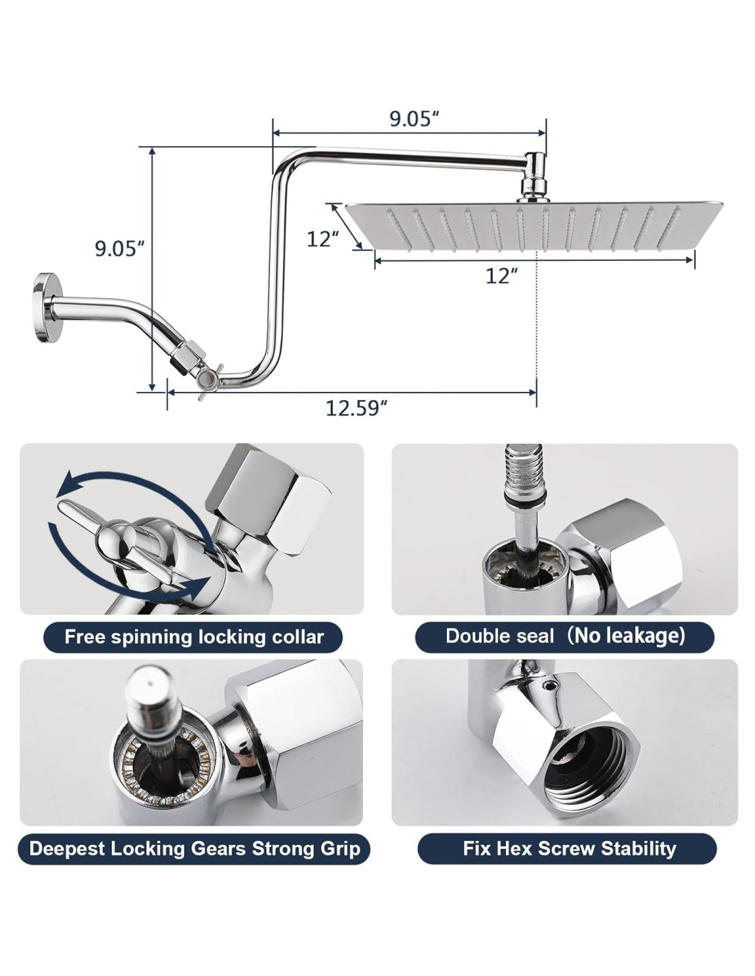 - Cabezal de Ducha de Lluvia de 12 pulgadas: Para una ducha de cobertura total y calidad de spa; El diseño de aire ahorra agua mientras mantiene la presión; Junta de bola de latón para el ángulo deseado; Boquillas de silicona autolimpiantes para evitar obstrucciones