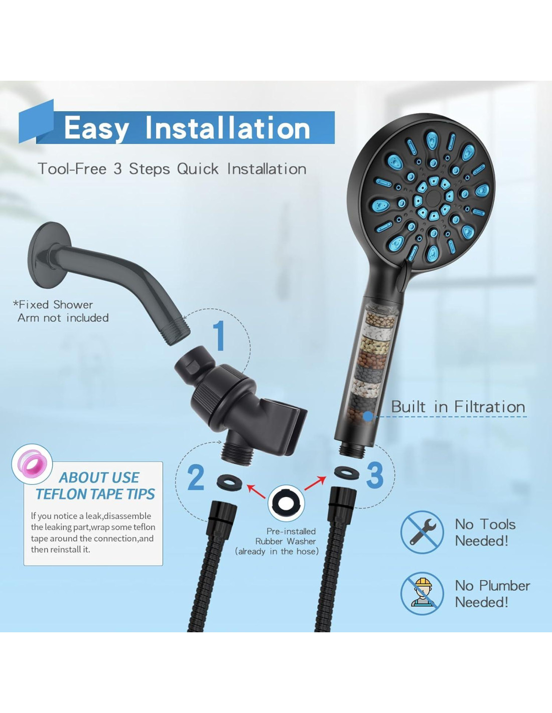 - [Fácil Instalación] : Instalación rápida en 3 minutos, no se requiere plomero ni herramientas. Proporcionamos todos los accesorios necesarios para su fácil instalación. Con un cabezal de ducha de mano (filtro integrado), manguera de acero inoxidable de 71" (180.34 cm), un soporte de ducha, arandelas de goma y cinta de teflón a prueba de fugas. Si tiene alguna pregunta, no dude en contactarnos, estaremos disponibles 24 horas al día para atenderle