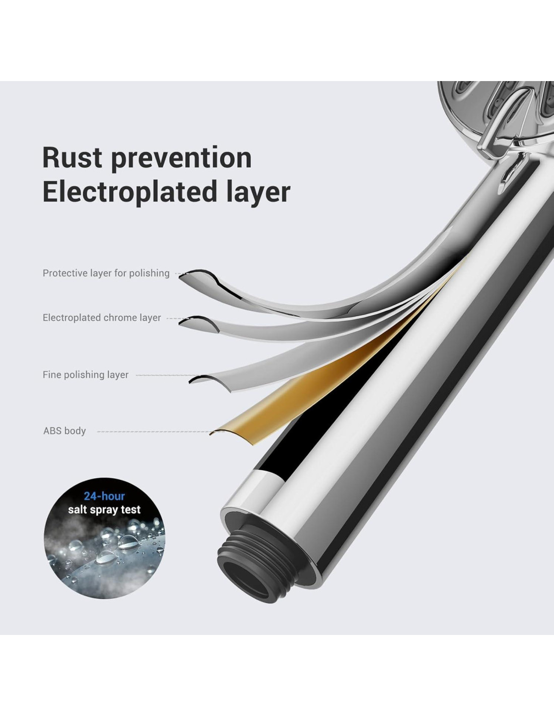 - Cabezal de Ducha de Materiales Premium: Este cabezal de ducha portátil está hecho de material ABS de alta calidad, ligero, resistente a la corrosión y a la decoloración. El proceso de cromado premium asegura que la superficie se mantenga brillante y nueva incluso después de años de uso. El panel ancho de 4.7 pulgadas (11.9 cm) proporciona una experiencia de ducha más cómoda.