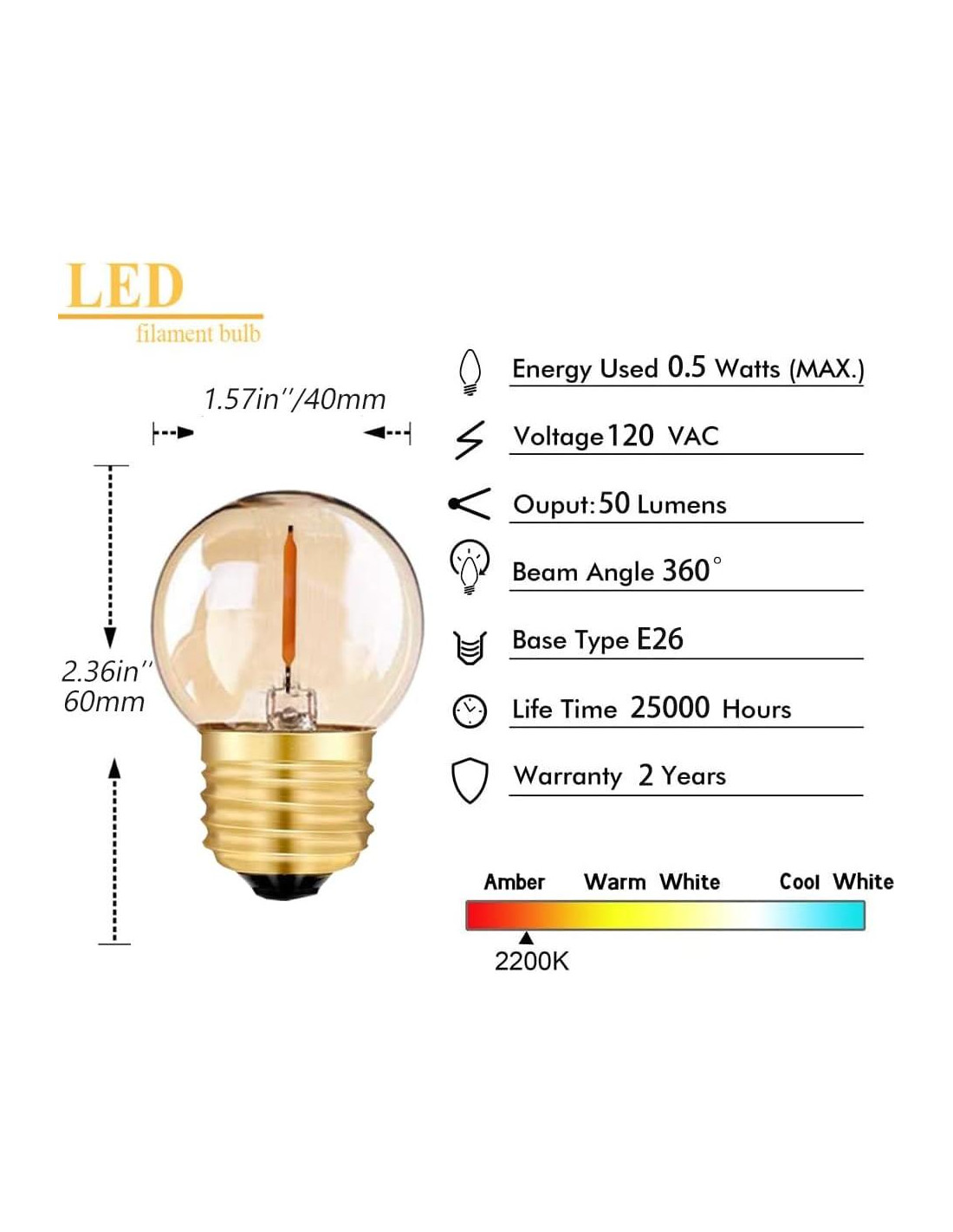 - Multipropósito La bombilla de forma de globo led de diseño vintage G40, con una elegante cubierta de vidrio ámbar/dorado. Uso amplio en Luces de Bistro, bares, dormitorio, sala de estar, comedor, cocinas, vestíbulos, carpas grandes, luces de cadena decorativas, lámparas de mesa, lámparas de pie, tocadores de baño, accesorios colgantes, accesorios de techo como ventiladores de techo y decorar cualquier ocasión de celebración. Una buena alternativa a las lámparas incandescentes.
