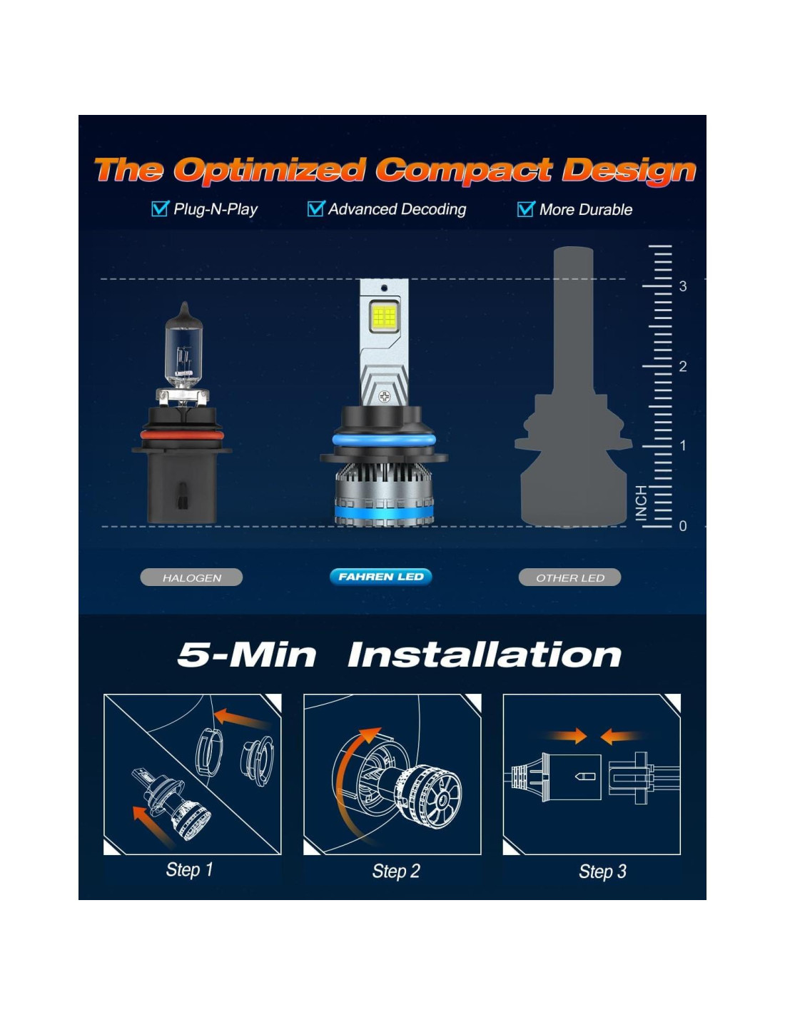- Instalación Fácil en 10 Minutos Las Bombillas de Luz de Niebla FAHREN 9007/HB5 imitan las bombillas halógenas de fábrica para una experiencia de enchufar y usar sin problemas. Con un decodificador adicional para un rendimiento mejorado, aseguran una instalación sin complicaciones en 10 minutos. El diseño todo en uno con tamaño halógeno 1:1 no requiere controladores o conectores externos, mientras que la duradera carcasa de aluminio aeronáutico asegura una instalación confiable y sin preocupaciones.