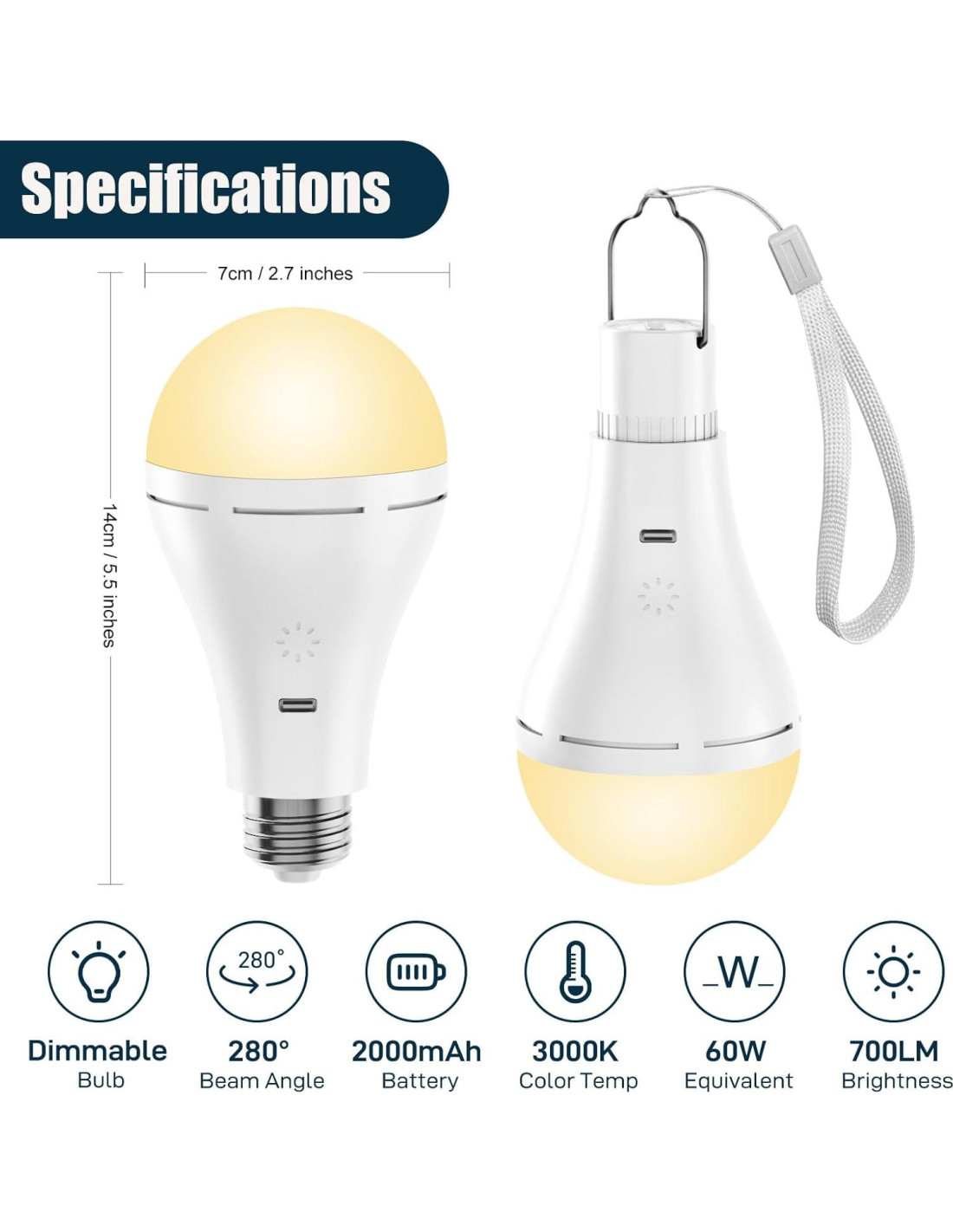 - [ Más que una Bombilla LED ] - Con una base superior adicional con gancho y cordón, la bombilla LED recargable es más que una simple bombilla para lámpara o luz colgante. Puedes usarla como luz para exteriores que te permite explorar aventuras al aire libre como camping, pesca, senderismo, etc. También es ideal para mercados de vendedores, pequeños negocios de repostería, granjas, casas de almacenamiento, garajes, establos, sótanos o cualquier área donde necesites luz extra temporal