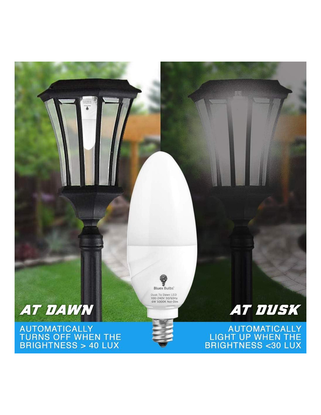 Fácil de instalar con una base E12, estas bombillas candelabro vienen en un conveniente paquete de 4 para que puedas reemplazar múltiples bombillas a la vez. Úsalas alrededor de tu terraza, junto al garaje, en tu puerta principal, en el patio trasero o en la entrada de tu camino para proporcionar la luz necesaria cuando está oscuro afuera. Estas bombillas también son excelentes para espacios interiores, incluyendo garajes, sótanos, lavanderías, porches cerrados y mucho más. Para asegurar que las luces se enciendan, debe haber una distancia mínima de 1 metro (3.28 pies) entre las dos lámparas. Aunque las bombillas estarán encendidas durante toda la noche, aún así reducirán tu factura de electricidad. La bombilla de bajo consumo de 6 vatios (equivalente a 60 vatios) emite 580 lúmenes de luz, pero utiliza menos energía y dura más tiempo, por lo que no tendrás que lidiar con la molestia de reemplazarla durante años. De hecho, cada bombilla puede durar hasta 30,000 horas, lo que la hace prácticamente libre de mantenimiento. No quieres desperdiciar energía y lidiar con altas facturas de electricidad al encender las luces por la noche, solo para olvidar apagarlas cuando te levantas por la mañana. Particularmente útil para iluminación exterior con clasificación de humedad, cada Bombilla LED Bluex de Dusk a Dawn está diseñada con un sensor de luz incorporado para encenderse automáticamente al anochecer y apagarse al amanecer. Puede ser difícil - sin mencionar peligroso - aventurarse por la noche cuando está oscuro. Al encenderse cuando comienza a oscurecer, estas Bombillas E12 pueden definitivamente iluminar el problema. Esto es ideal cuando llegas a casa tarde en la noche, tienes que salir a pasear al perro, o mientras estás de vacaciones para mejorar la seguridad y desalentar a los intrusos. Disponibles en tu elección de una temperatura de color blanco cálido de 3000K o blanco diurno de 5000K, estas Bombillas LED de Dusk a Dawn son una alternativa más segura. No contienen mercurio y no liberan gases peligrosos, creando un ambiente saludable para ti y tu familia. Además, no hay necesidad de preocuparse si una bombilla se rompe o sobre tener que reciclarla.