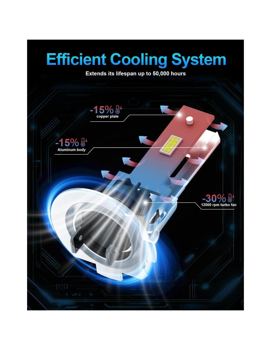 - Disipación de Calor EficienteLas bombillas de luz de niebla H7 de lupuauto están diseñadas para durar con una carcasa de aluminio de grado aeroespacial, ventilador de enfriamiento silencioso de 12000RPM, durabilidad avanzada y gestión de disipación de calor, resisten la degradación de la luz, mejorando directamente la eficiencia en un 95%. Los sellos de goma resistentes a altas temperaturas y anti-envejecimiento mejoran la durabilidad mientras previenen la degradación de la luz y ahorran energía. Este sistema de enfriamiento avanzado asegura una rápida disipación de calor para un funcionamiento estable y sin interrupciones.