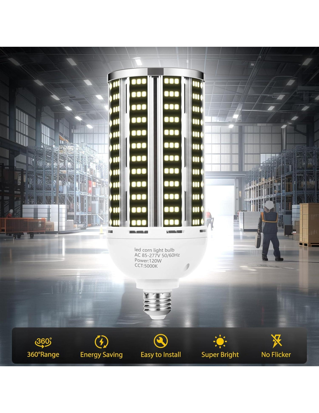 - Ahorro de energía: la bombilla LED de maíz de 120W es adecuada para AC100-277VAC, salida de brillo de 15900 lúmenes. bajo el mismo brillo, 90% de ahorro de energía en comparación con el reemplazo de 590W-610W Metal Halide/HID/HPS y bombilla incandescente de 1200W. Súper brillante con 150 lm/w alta eficiencia de vatios a lúmenes
