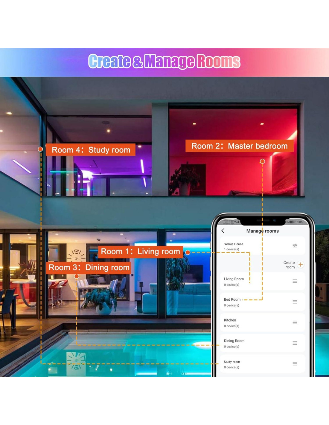 - [Iluminación Inteligente para Todo el Hogar] La tecnología inalámbrica Bluetooth de Bajo Consumo (BLE) 5.0 permite un alcance mayor, habilitando instalaciones en toda la casa. Cada bombilla inteligente BR30 multicolor actúa como un repetidor de señal, para que puedas crear un grupo de varias bombillas inteligentes y encenderlas y apagarlas con solo un comando.