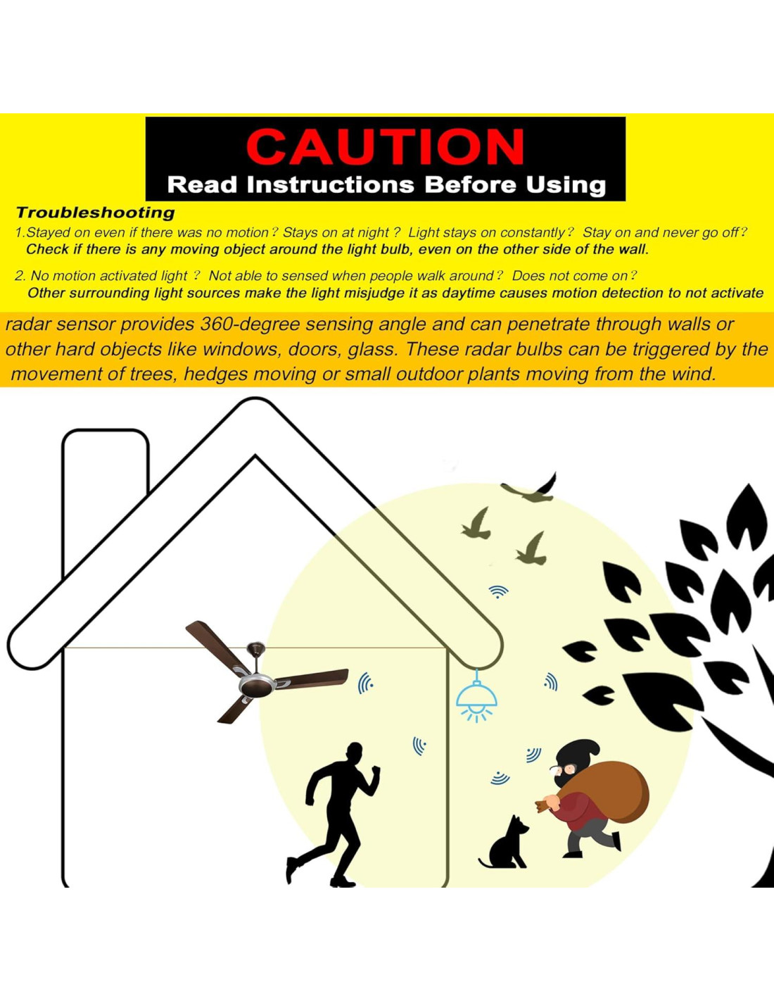 - Lo Que Obtienes: 2 bombillas de luz con sensor de movimiento (precaución de instalación: 1. Asegúrate de que la distancia entre 2 bombillas sea más de 2m. 2. Por favor, mantén siempre la energía y el interruptor encendidos. 3. Por favor, no uses las bombillas de luz con detector de movimiento junto con un interruptor que tenga funciones como sensor táctil, sensor infrarrojo, control por voz y luz, etc.)