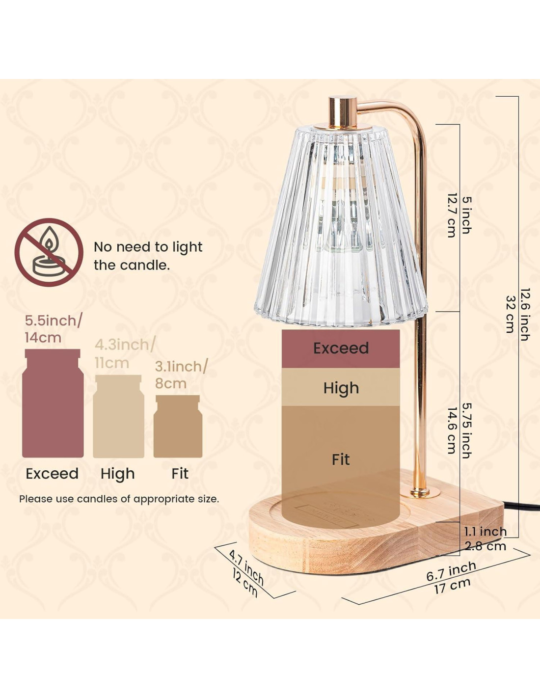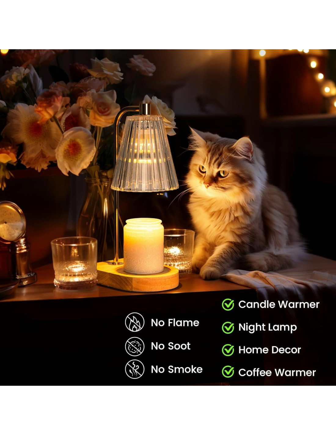- Estética de Decoración Acogedora: Esta lámpara calentadora de velas es una fusión armoniosa de una base de madera rústica, una pantalla de lámpara de vidrio ribeteado claro y un elegante poste dorado champán curvado, estilizando cada estética y decoración del hogar. Como pieza decorativa multifuncional, calienta suavemente cera aromática y velas en tarro, transformándolas en una delicada fragancia que realza la decoración de otoño para salas de estar, dormitorios, oficinas, residencias estudiantiles y más.