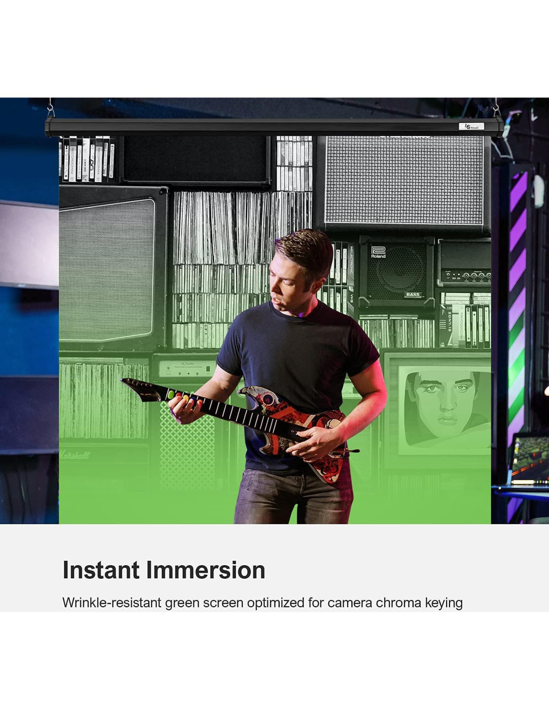 Un panel de croma clave perfecto o fondo verde, ideal para transmisión en vivo, juegos, educación y negocios. Cuando se trata de producción de contenido, esta gran pantalla verde es la elección perfecta para los streamers que desean efectos visuales de croma clave impecables. 59(W) x 72(H) in (1.50 x 1.83 m) 62(L) x 2.5(W) in (1.57 x 0.06 m) Pantalla verde montable en su pared o techo, tire del mango hacia abajo a cualquier posición, y deje que el rodillo de precisión bloquee automáticamente su pantalla en su lugar. El panel de croma clave verde montable redefine lo que puede esperar de la tela de composición de grado de estudio. Fibras premium aseguran una extensión duradera y sin arrugas, mientras que el croma verde optimizado garantiza la clave más limpia que puede obtener.
