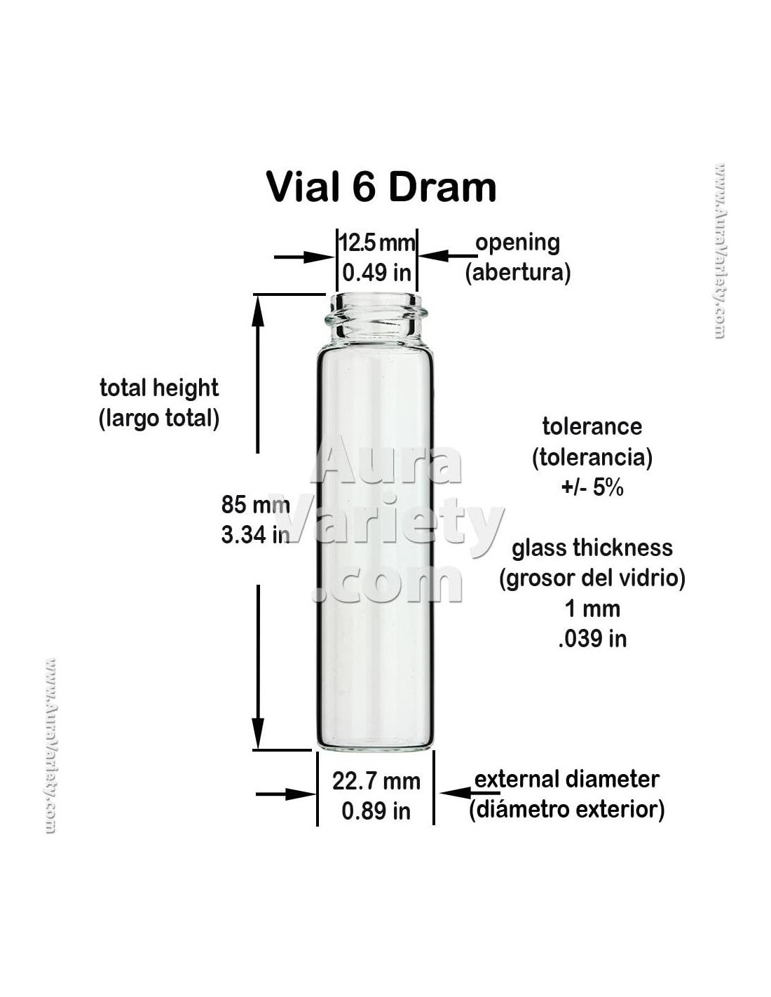 Estos frascos resistentes están hechos de un pesado vidrio de borosilicato para una excepcional resistencia y durabilidad, sin embargo, todavía son lo suficientemente económicos como para usarlos y desecharlos si es necesario. Geniales para manualidades, cosméticos, regalos de fiesta, especias de cocina, aceites esenciales, minería de oro, perfumes, reactivos, así como productos farmacéuticos, pastillas y productos secos. Frascos de vidrio transparente, enroscados, 6 dram (22.18 mL), 22.7 mm (0.89") x 85 mm (3.34") de alto, acabado de rosca 20-400 GPI, con tapa de fenólico negro adjunta. Estos son frascos nuevos, sin embargo, puede haber rasguños o marcas ligeras en el exterior de los frascos durante la producción del fabricante.
