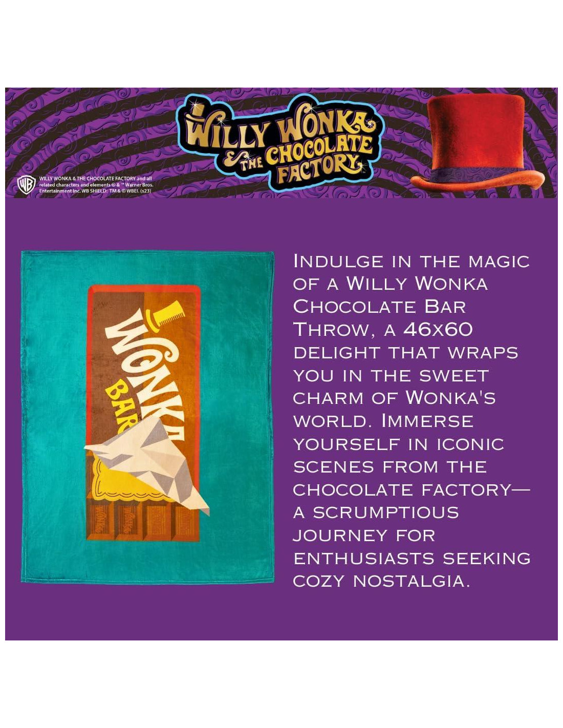 - DISEÑO DE MANÍ: Disfruta de la magia de una manta de barra de chocolate Willy Wonka, un deleite de 46x60 (116,84 cm x 152,4 cm) que te envuelve en el dulce encanto del mundo de Wonka. Sumérgete en escenas icónicas de la fábrica de chocolate, un delicioso viaje para los entusiastas que buscan nostalgia acogedora.