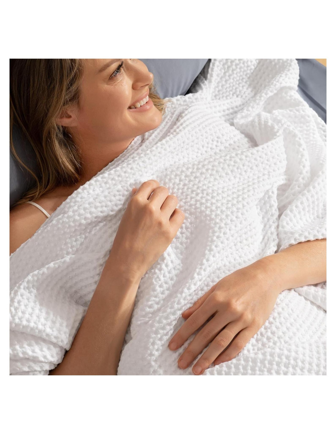 - Duradera - Lavable a Máquina: Incluso con lavados semanales a máquina, estas mantas conservan su elegante textura de waffle. De hecho, la textura se vuelve más pronunciada después de cada lavado. Después de más de 50 ciclos de prueba, no hay pilling ni decoloración, ni se engancha ni se tira.