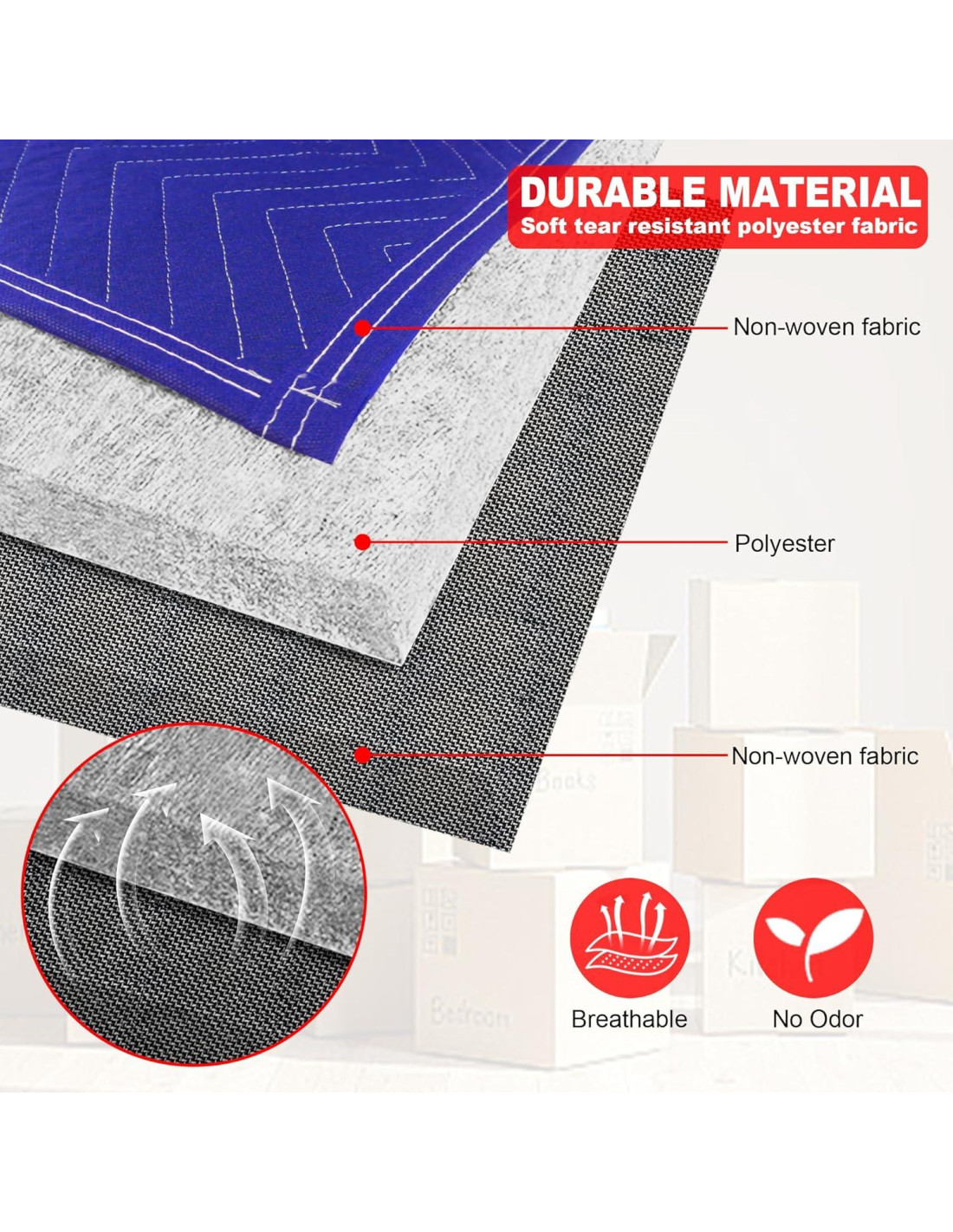 - 100% fibra de poliéster: El exterior de estas mantas para muebles está cubierto con tela no tejida y lana de algodón, que protege y almacena muebles, artículos frágiles, pisos y puertas de rasguños, colisiones, suciedad, humedad y otros tipos de daños al mudarse.