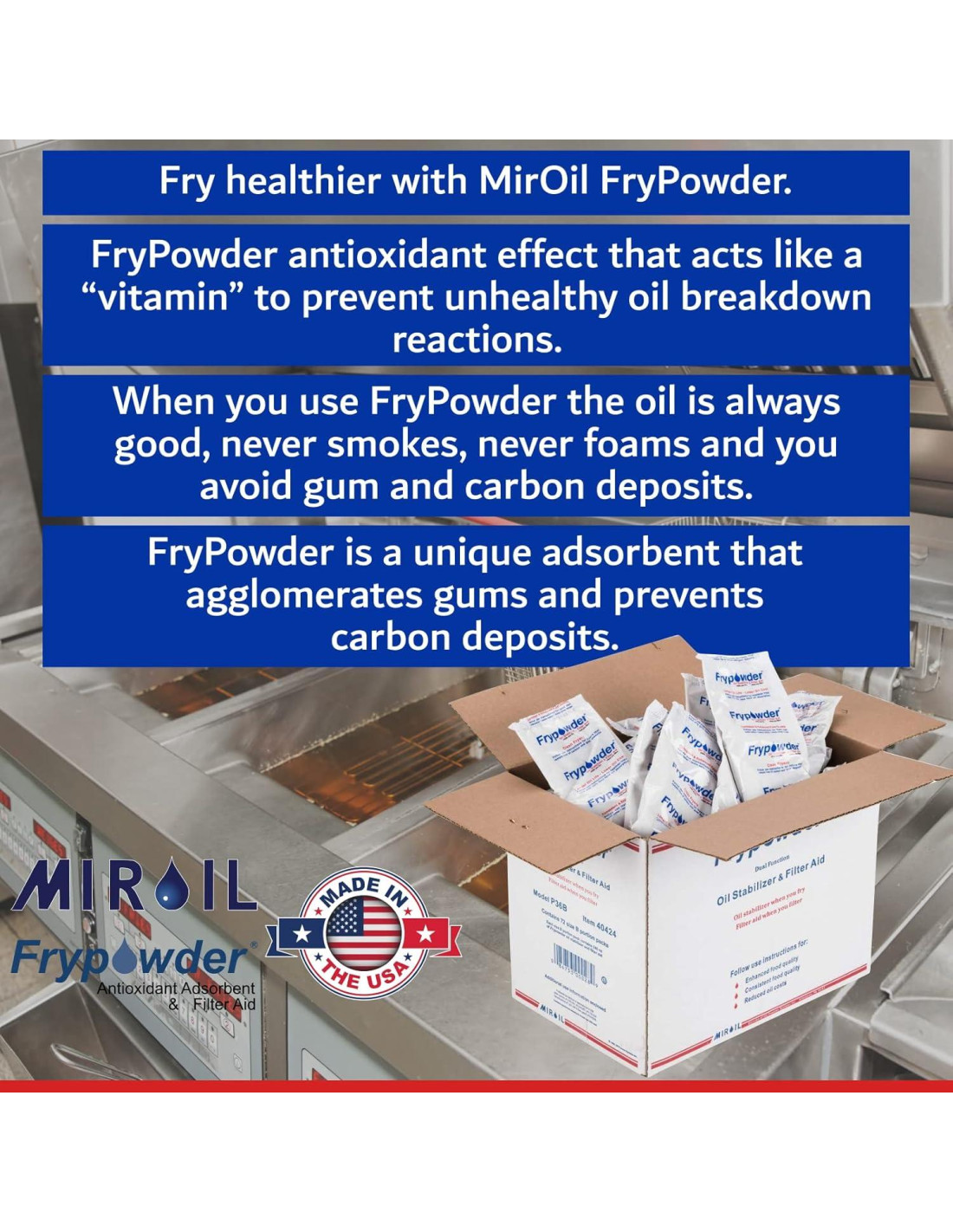 - MEJOR SABOR, ACEITE MÁS LIMPIO Y TIEMPOS DE COCCIÓN MÁS RÁPIDOS - Polvo para Freír ofrece una calidad de alimentos mejorada y un rendimiento de aceite extendido en cada sesión de fritura. Simplemente agrégalo al aceite caliente al inicio de cada ciclo de fritura de 6-8 horas para disfrutar de texturas más crujientes, mejor apariencia de los alimentos y tiempos de cocción reducidos. Polvo para Freír previene el humo, la espuma, la acumulación de goma y los depósitos de carbono, manteniendo tu aceite de freír más limpio y eficiente. Actuando como un estabilizador de aceite y ayuda de filtrado, extiende la vida del aceite, reduce la necesidad de cambios frecuentes y mantiene tu freidora operando a su máximo rendimiento, convirtiéndolo en el ahorrador de aceite ideal para cocinas comerciales y freidoras de alto volumen.