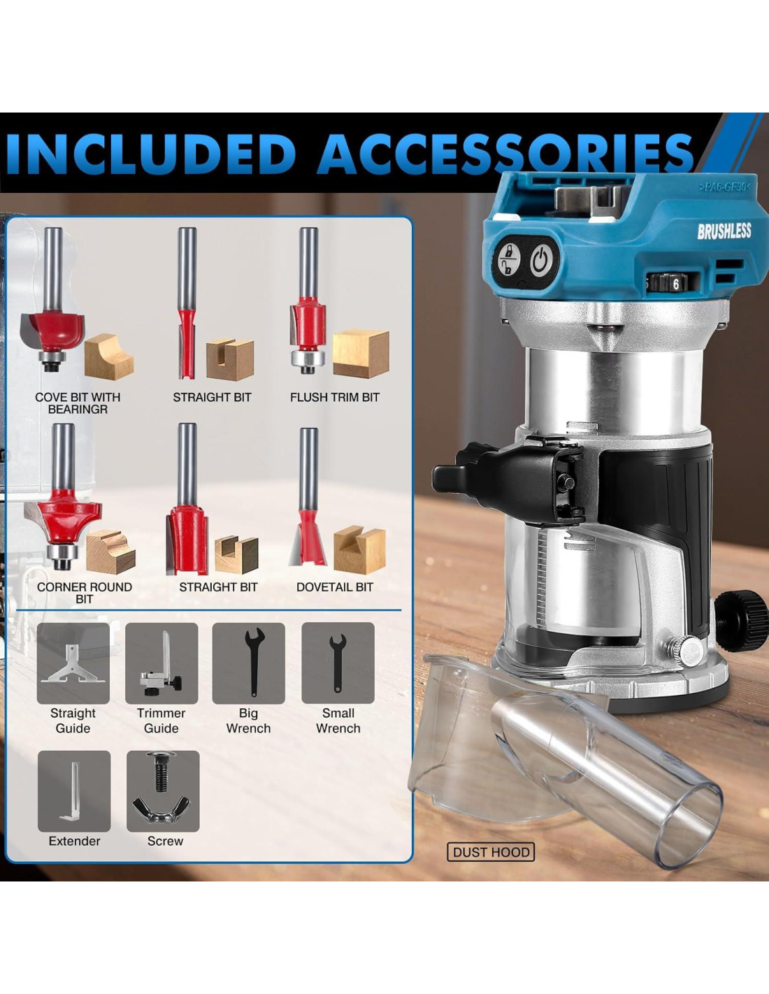 - Kit de accesorios completo. Incluye accesorios esenciales como guía de borde, guía de rodillo, protector de aluminio, puerto de recolección de polvo y 6 fresas. Estas herramientas mejoran la precisión, proporcionan mejor control y mantienen tu espacio de trabajo limpio.