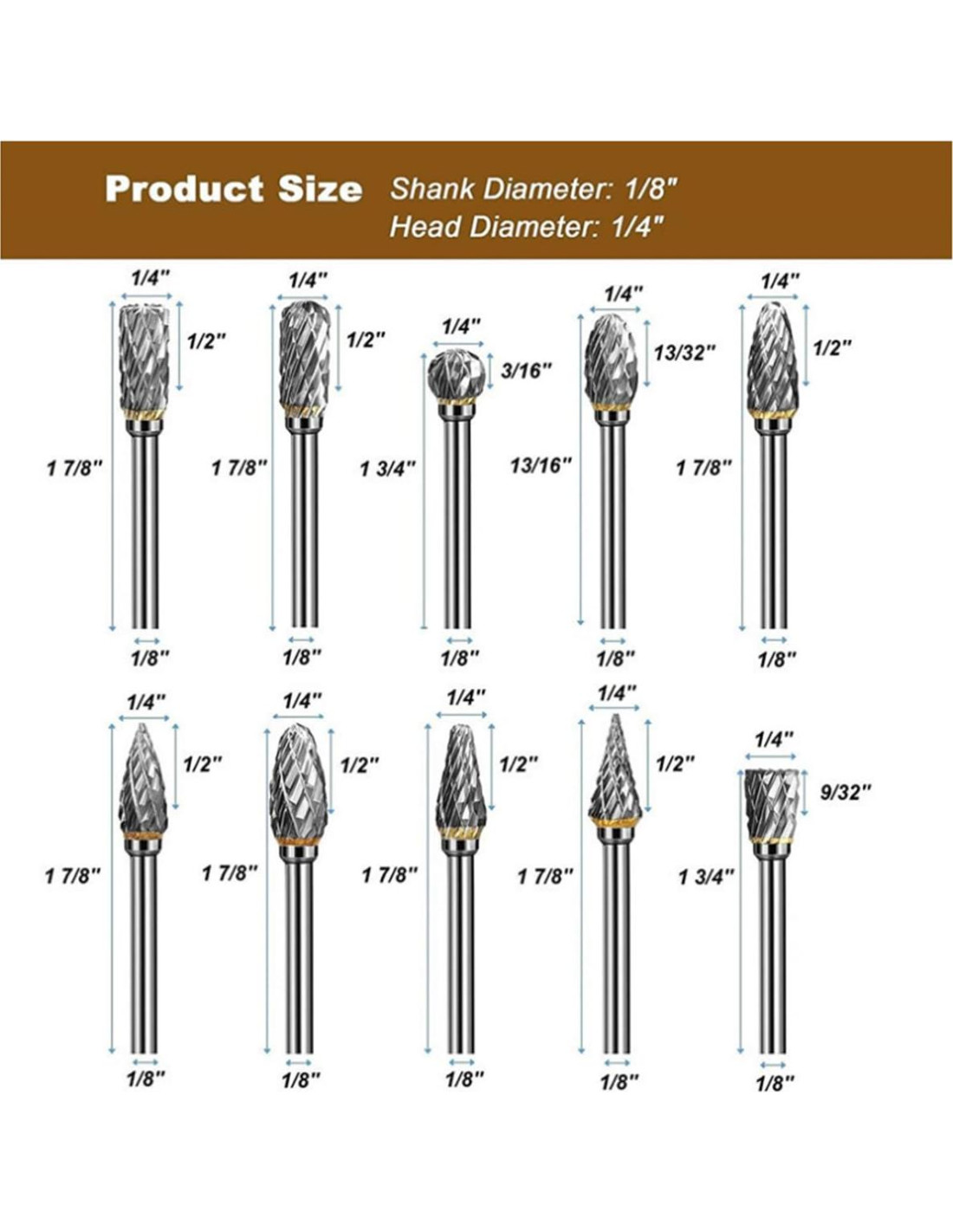 - [Conjunto de Buriles de Carburo] : Estos bits de carving están hechos de acero de tungsteno de carburo para una larga vida, robustos y duraderos. Diámetro del mango: 1/8'', Longitud total: 45-50mm, Diámetro de corte: 1/4''. El mango de 1/8'' se adapta a la mayoría de las pequeñas herramientas rotativas con mandril de tres garras.