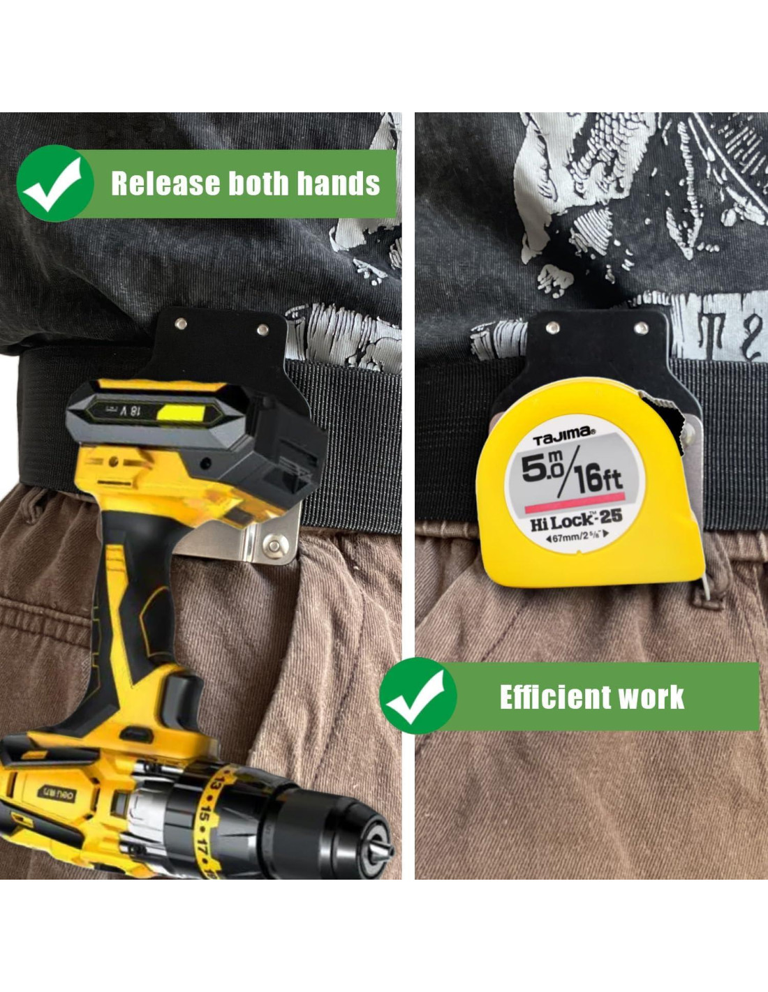 - Relaja Tus Manos: Nuestro soporte para cinta métrica se puede asegurar fácilmente a un cinturón, bolsillo o kit de herramientas. Simplemente abrocha las herramientas que necesitas al marco de acero, se puede llevar y usar fácilmente, permitiéndote liberar tus manos