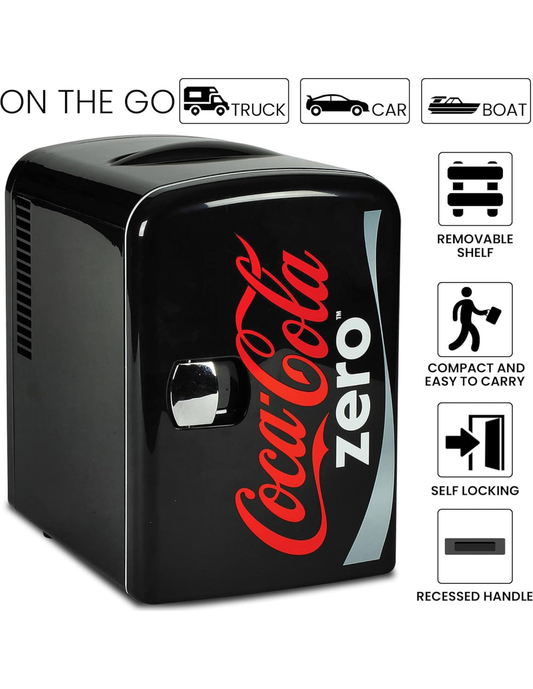 - ÚNICO Y ESTILOSO: Mini nevera personal con silueta de refrigerador retro redondeado que presenta el logo oficial de Coca-Cola Zero