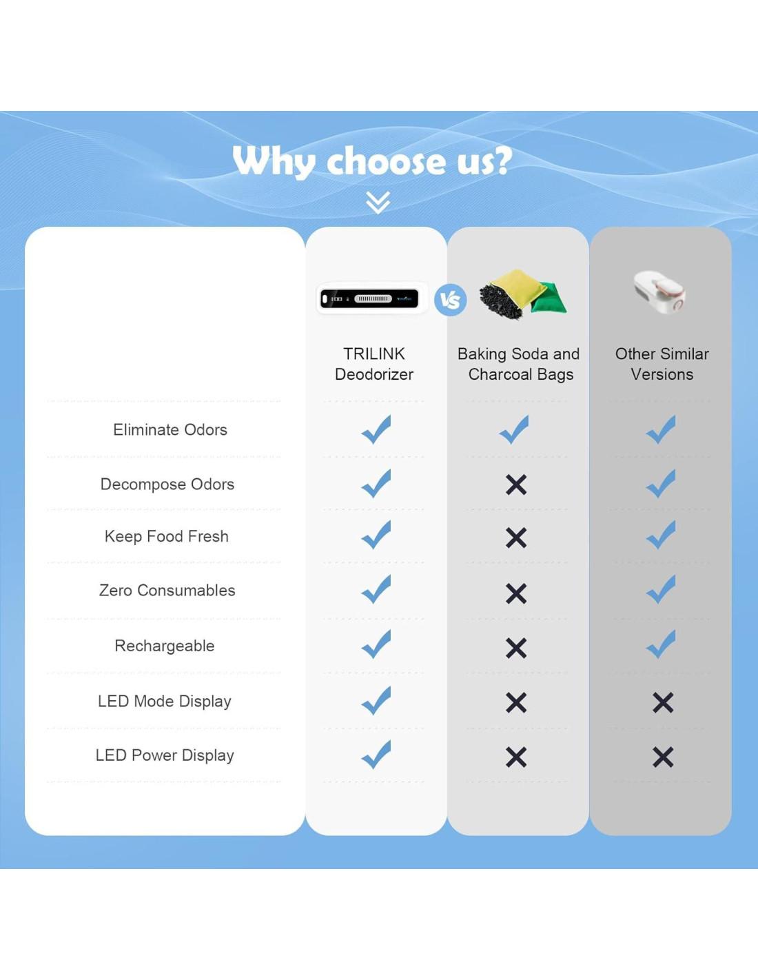 - Desodorante O3 Multifuncional - El desodorante para refrigerador TRILINK puede reducir efectivamente los olores desagradables en entornos cerrados como refrigeradores, congeladores, armarios de zapatos, closets, guardarropas, coches, habitaciones de mascotas, etc. También prolonga la vida útil de los alimentos y mantiene los alimentos frescos.