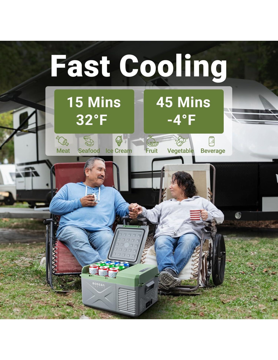 - Enfriamiento Rápido y Bajo Consumo de Energía: Refrigerador de coche BODEGACOOLER con tecnología de refrigeración por compresor, este enfriador de coche podría lograr un enfriamiento rápido de 15 min de 68F a 32F y 50 min de 32F a -4F. Di adiós a la molestia de usar hielo, además, este refrigerador portátil tiene un consumo promedio de energía de solo 45W, incluso cuando funciona en modo MAX, consume mucho menos de 1kWh por día.